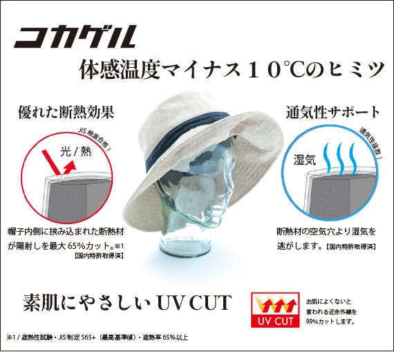 『コカゲル・ハット』は日差しによる熱を65%カット。