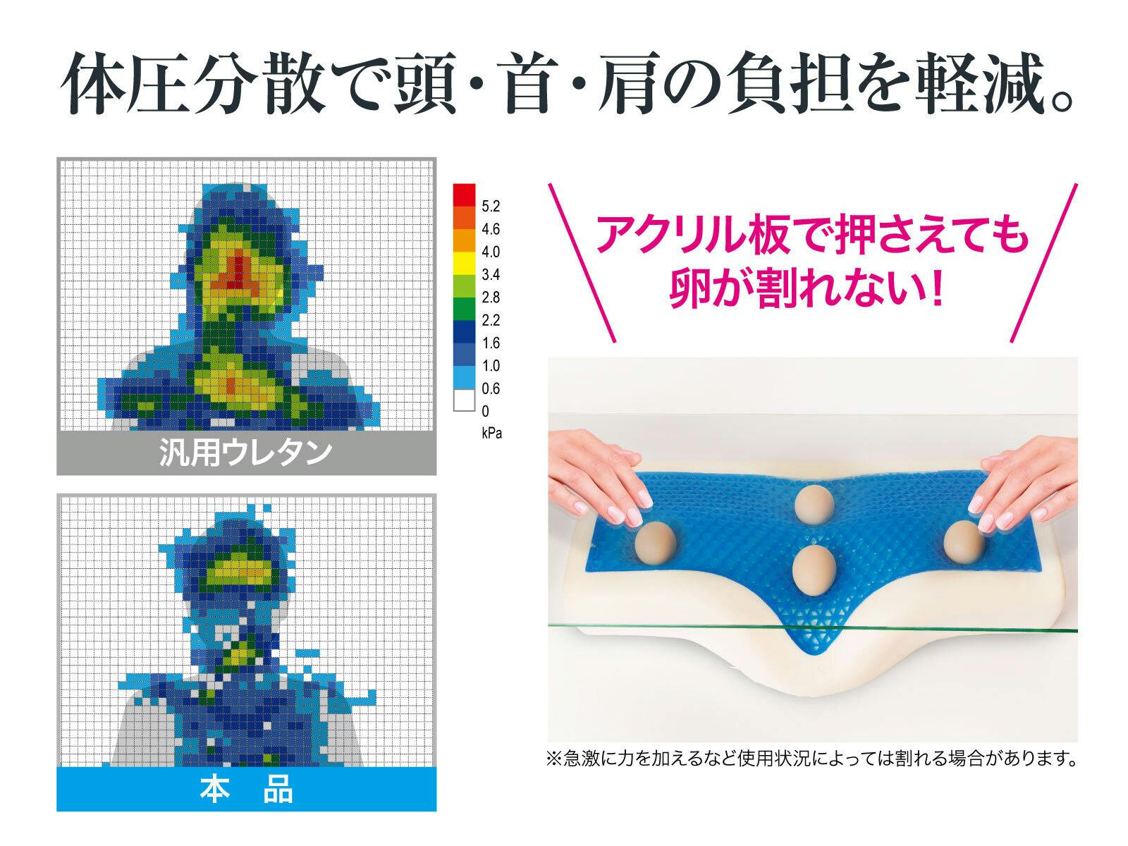 「プレミアム3Dゲル枕」を使用すると体圧が集中しにくく、広い範囲に分散されるので、頭・首・肩を支えて負担を軽減します。この体圧分散により浮いたような寝心地を感じられます。プレミアム3Dゲル枕に、上から卵を落としても割れない事を証明。アクリル板で卵を押さえても割れませんでした。