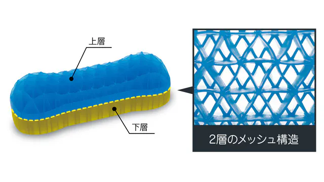 私たちはアウトドア枕に求められる快適性をただ単に柔らかいだけでなく、柔らかさの中にもしっかりとした安定性(コシ)が必要と考えました。それを実現する為にゲル枕は2層構造になっています。上層ゲルは、頭の形に柔軟に対応し沈み込みます。その沈み込み過ぎを抑制するために三角形をずらして下層を配置しています。これがオフセットレイヤー構造です。これにより頭を置いた位置から下層に行くほど徐々にしっかりしてきます。重たいものを包み込むようにやさしく受け止めているイメージです。