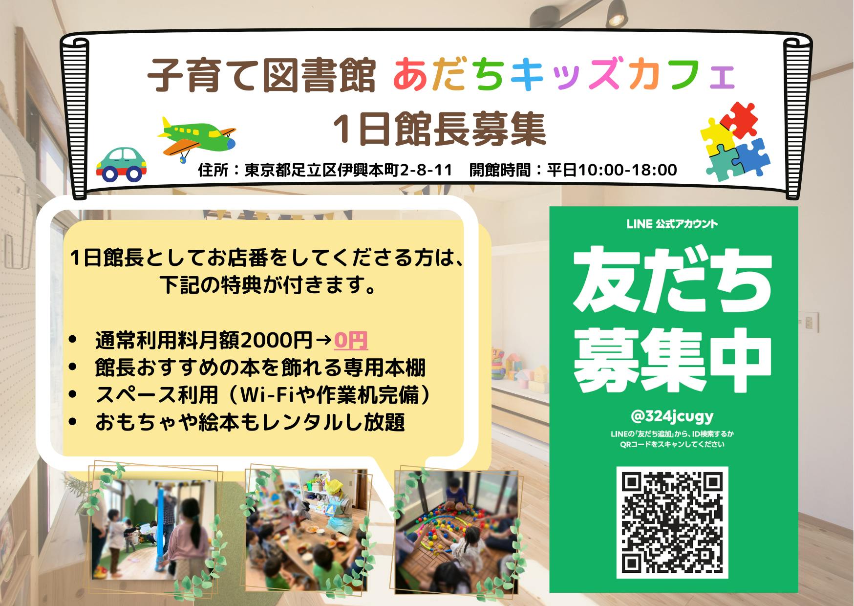 2022/11/03 19:41【日替わり館長募集開始!】皆様のご支援によりオープンしました「あだちキッズカフェ」(足立区伊興本町2-8-11)で、日替わり館長募集します!『館長になると利用できる特典一覧』①スペース利用(Wi-Fiや作業机完備)②おもちゃや絵本もレンタルし放題③専用本棚におすすめの本などを飾れる●特典詳細①スペース利用(Wi-Fiや作業机完備)→コワーキングスペースとしての利用や、お子さんが遊ぶスペースとしての利用もOK!②おもちゃや絵本もレンタルし放題→小さいお子さんのいる保護者の方は、お子さんが気に入ったおもちゃや絵本を借りてもOK!さらに、③専用本棚におすすめの本を飾れる通常月額2,000円の「本棚オーナー」サービスも付いてきます。個人事業主や作品を作られている方は、地域住民への広告スペースとしてお使いいただけます。***●日替わり館長にお願いしたいこと①ご利用者様へのおもちゃや絵本の貸し出し対応②おもちゃや絵本の整理整頓③食品を受け取りに来る方の対応***●日替わり館長シフトについてご都合のよい曜日と時間帯をお知らせください。都合がつかない日は事務局にご相談いただければ、シフト変更をさせていただきます!平日(月曜日から金曜日)の下記2種類の時間帯からお選びください。①10:00-14:00②14:00-18:00▶︎紹介ページhttps://choiceful.official.ec/お問い合わせはこちらから▶︎子育て図書館『あだちキッズカフェ』https://lin.ee/MM6el7E もっと見る