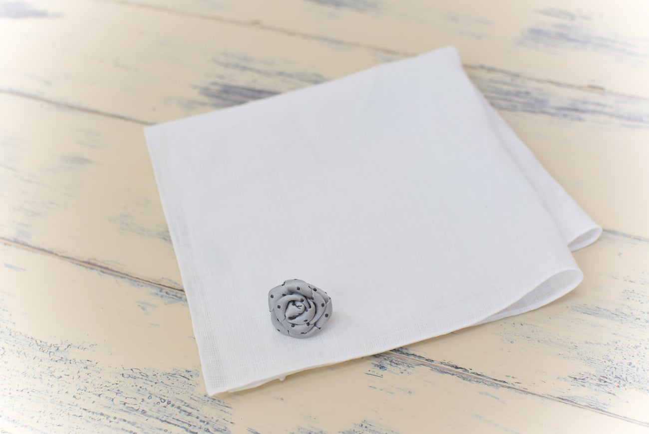ポケットチーフとローズ型のピンズのセットです。色は白×シルバードット、ピンク、ラベンダーの3種類からお選びください。送料・消費税込み