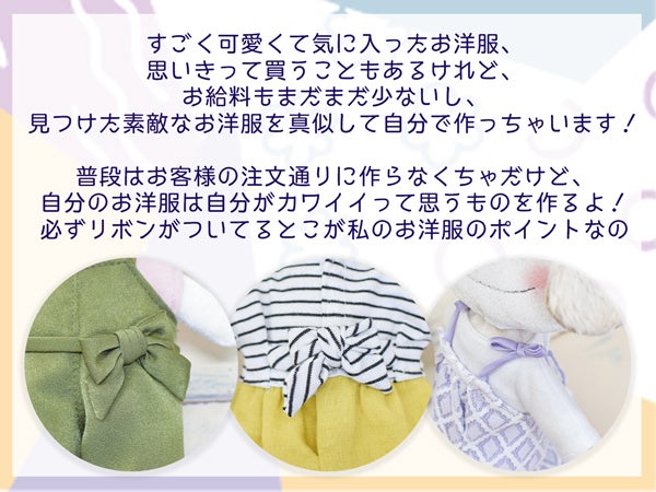 今回ご用意したgooちゃんの3種類の服と同じ生地で作ったリボンシュシュを1つお送りするリターンです。3種類あるので、お好きな柄をお選びください。 下の写真では左から、サロペットコーデ、ボーダーカットソーコーデ 、レースのワンピースのデザインとおそろいの柄となっています。送料・消費税込み