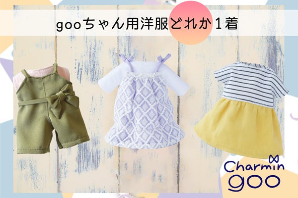 gooちゃん本体は含まれておらず、洋服のみのリターンです。洋服は3種類あるので、お好きな洋服をお選びください。下の写真では左から、サロペットコーデ、レースのワンピース、ボーダーカットソーコーデのデザインとなっています。送料・消費税込み