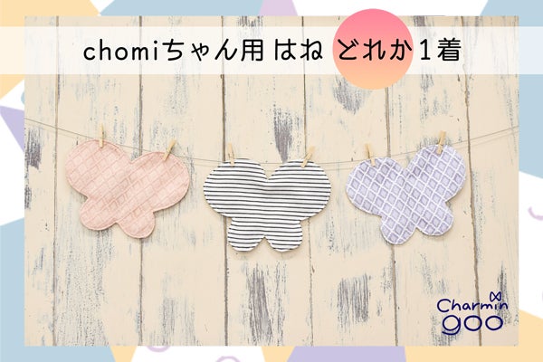 chomiちゃん1体とはね1着がセットとなるリターンです。はねの柄は3種類あるので、お好きな柄をお選びください。下の写真では左からピンクのレース、ボーダーカットソー、白のレースとなっています。送料・消費税込み
