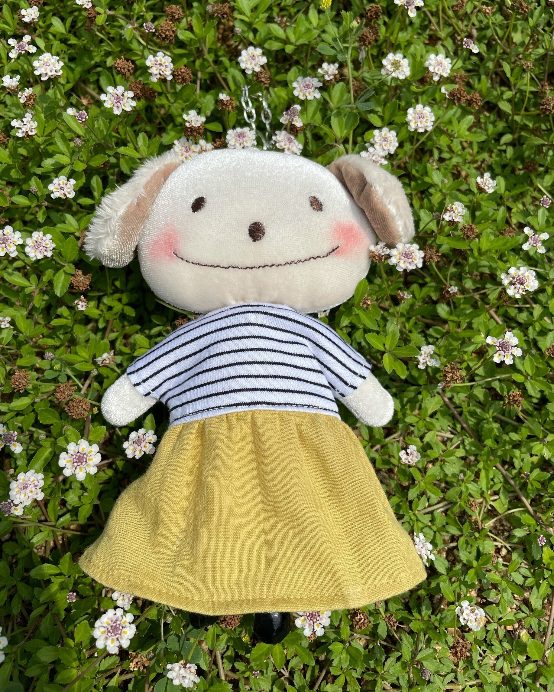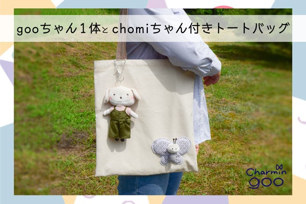 gooちゃん1体とトートバック1つのセットのリターンです。トートバックはchomiちゃんを縫いつけたデザインとなっています。gooちゃんの洋服の柄は3種類あるので、お好きな柄をお選びください。