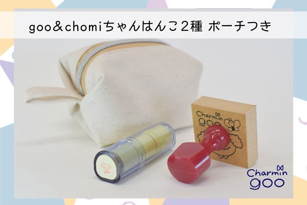 ゴム印goo+chomi(四センチ角) 、シャチハタ(gooちゃんの顔と名前)+ポーチが1つずつのセットのリターンとなっています。ポーチは判子を収納することができるようになっています。送料・消費税込み