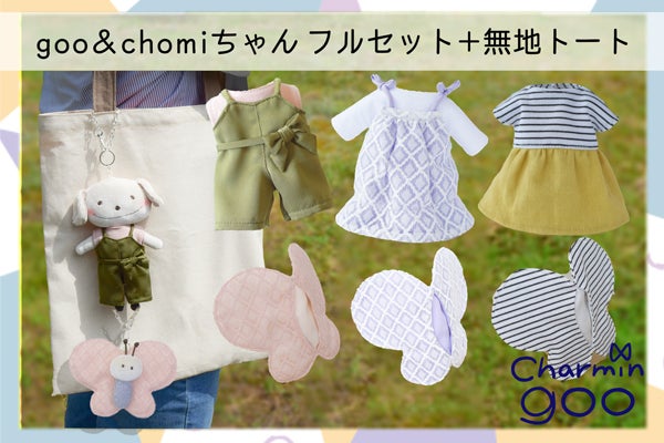 ・gooちゃん1体+服3着、chomiちゃん1体+はね3着+トートバックのフルセット @18,000円
