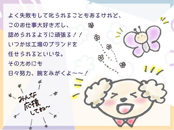 失敗も多いけど、楽しんで前向きに仕事する姿が認められて、工場の主要メンバーになっていき、ゆくゆくは工場のブランドを任せられるまでに成長していきます。