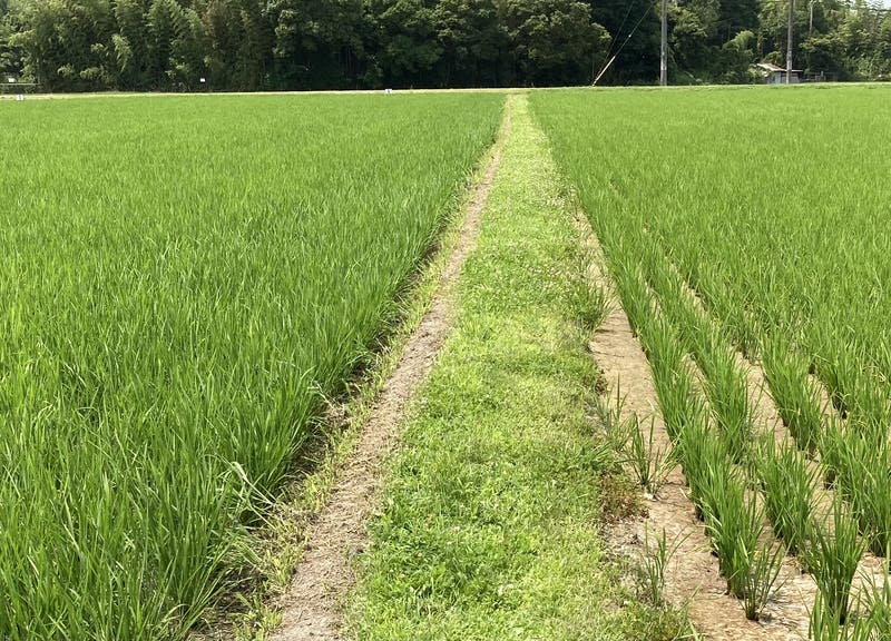 下の写真を見て貰えばわかりますが、右が私の田んぼです。一株一株の間隔を広く空けて決して稲に無理をさせず伸び伸び広々育てています。