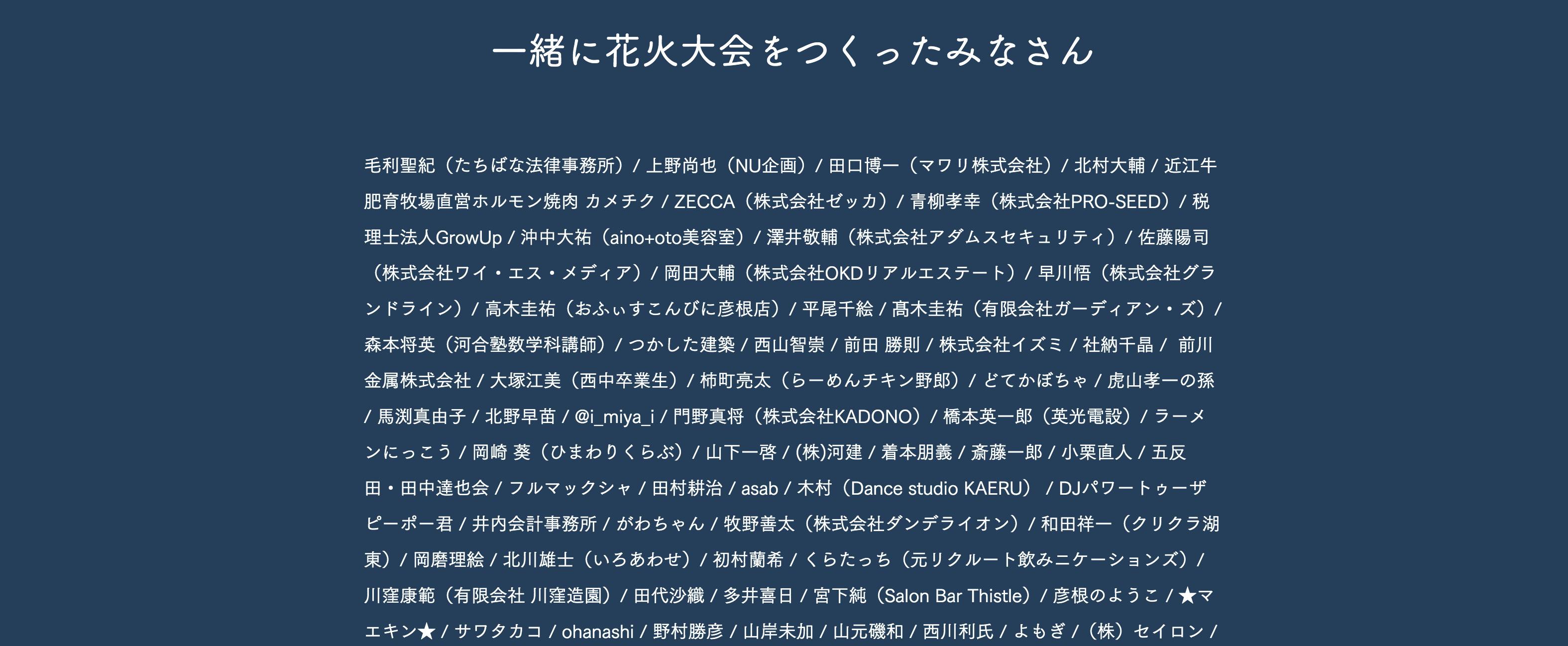 プロジェクト特設サイトにて、一緒に花火大会をつくった支援者として、お名前を掲載させていただきます。もし本名を出されたくない方は、ニックネームでも結構です。また、事業主の方などは()内に屋号掲載なども可能です。例:滋賀 太郎(びわこ株式会社)