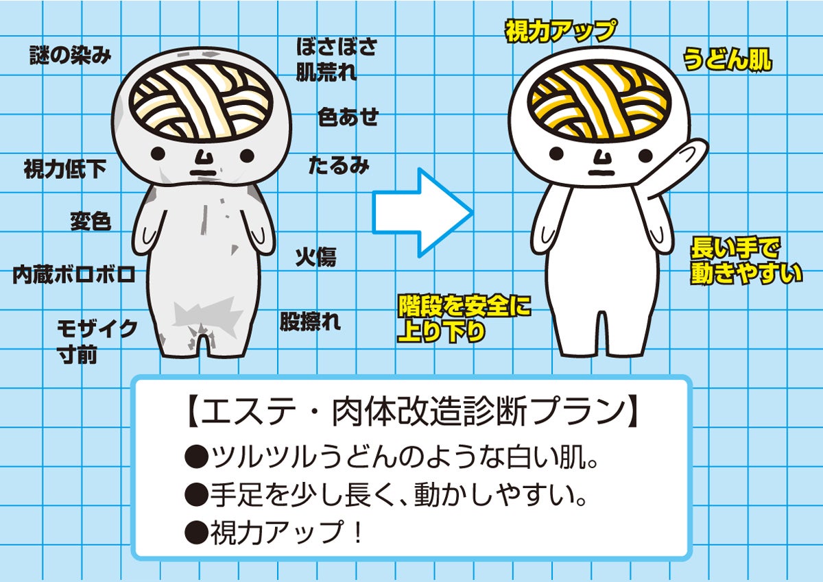 協会のある彦根市は、うどん脳の居る高松市と姉妹城都市として古くから交流があります。うどん脳も彦根市のひこにゃんと同じように、お肌の手入れには気を付けておられますが、やはり定期的なエステは必要です。皆様のご協力で、白い肌艶を取り戻して頂けることを願っております。