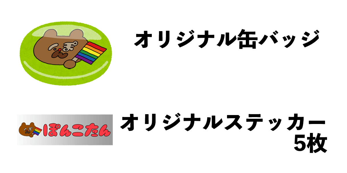 「ぽんこたん」オリジナル缶バッジ、オリジナルステッカー(5枚)のセット。