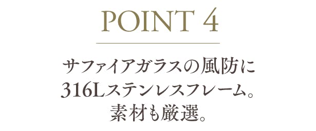 風防に採用したサファイアガラスはダイヤモンド、モアサナイトに次いで3番目に硬い物質であり、モース硬度は9です。耐傷性がとても高く表面は傷がつきにくい一方で、打ち付けるような衝撃には弱いという特性があります。