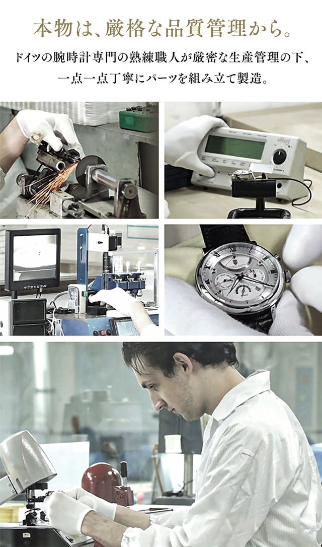 ドイツの腕時計専門の熟練職人が厳密な生産管理の下、一点一点丁寧にパーツを組み立てています。