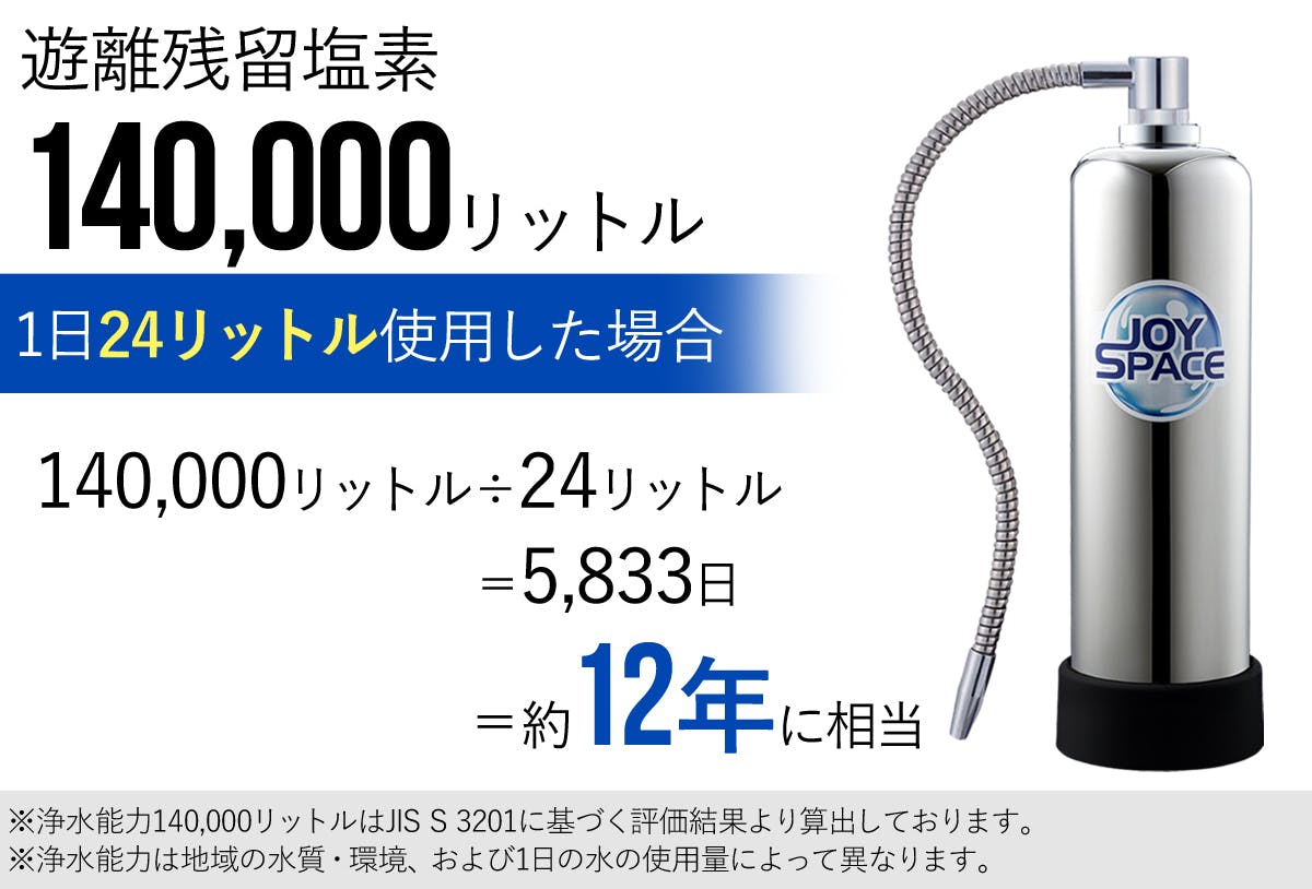 ジョイスペースの残留塩素除去能力はなんと140,000リットル!ペットボトル12本分の水の量を毎日使用しても、約12年カートリッジ交換不要です。安心してたっぷりのお水をお使いいただけます。