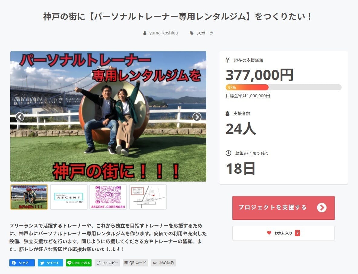 2021/08/19 00:12こんにちは!Rental Gym ASCENTです。この度は本プロジェクトをご覧、ご支援いただき誠にありがとうございます!本日でクラウドファンディング開始から5日が経過いたしました。画像でネタバレしてますが、開始5日時点での経過を発表します!なんと!24名、¥377,000のご支援をいただいております!たくさんのご支援ありがとうございます。残り18日、現在達成率37.7%です。Rental Gym ASCENT公式インスタグラムもございますので、ぜひフォローお願いいたします。公式インスタグラムはこちら↓https://www.instagram.com/ascent_corenoah/ 引き続きご支援、拡散よろしくお願いいたします。関西で活躍しているトレーナーさん、インストラクターさんがいらっしゃいましたらぜひご紹介ください。 もっと見る
