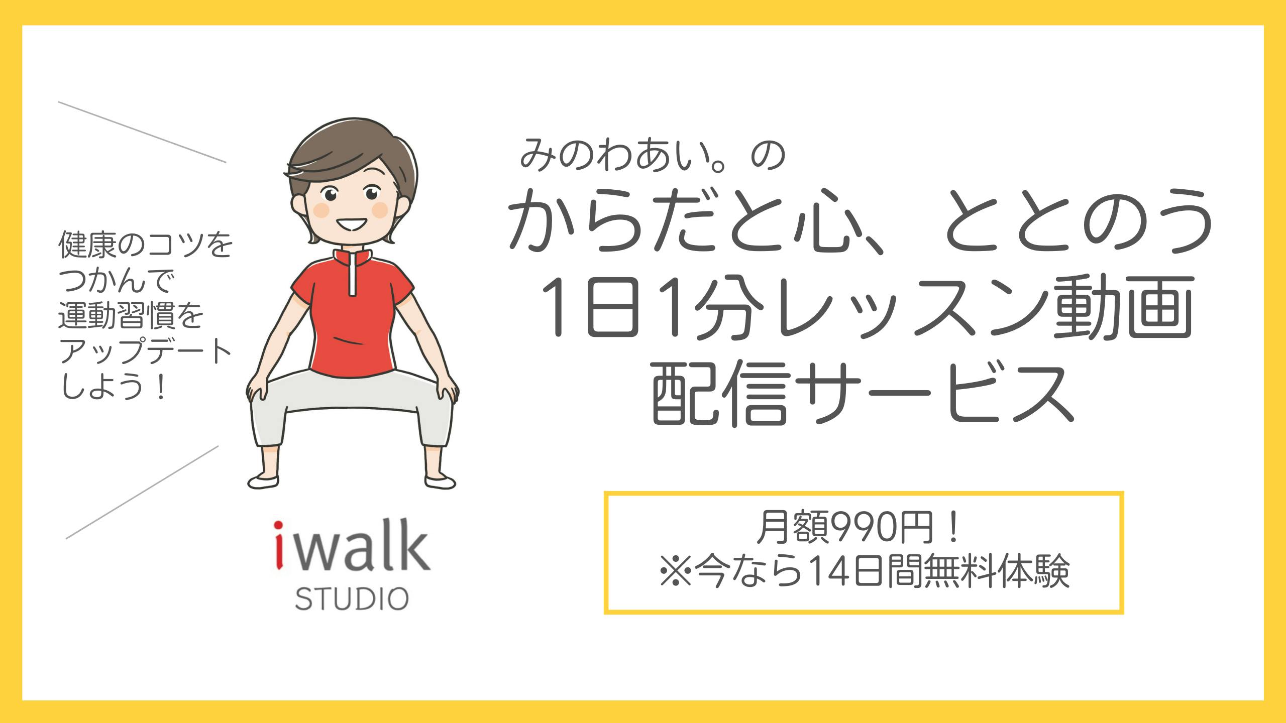 2022/12/20 17:04この度、ご好評いただいておりました「日めくりカレンダー」で配信させていただいた31動画含む、全60レッスンプログラムが見放題!!みのわあい。の「健康のコツをつかんで運動習慣をアップデートする! 心とからだ、ととのう1日1分レッスン」有料動画配信サービスをスタートします。https://iwalk.mish.tv/※三日坊主にならない!運動習慣をサポートするLINE配信付き!!--------------------------------------------------------------------毎日の暮らしの中でできる健康づくりがコンセプト。トレーニングウエアに着替えて、ジムにいかなくても、時間がなくてもあなたの健康づくりを応援したい。いつでもすぐにどこでもできるレッスンプログラムをご提供します!--------------------------------------------------------------------<サービスリリース記念キャンペーン実施中!!>○通常7日間の無料体験→14日間無料体験いただけます!(無料体験期間内に、キャンセルいただくと課金はございません)○「骨盤スクワット10日間チャレンジ」骨盤スクワットができるように下半身のサビ付きをとる10日間のレッスンプログラムです。人生初・美尻で、スッキリ新年を迎えましょう!チャレンジ期間:12/22〜12/31\みのわあい。のレッスン動画配信サービス/「健康のコツをつかんで運動習慣をアップデートする! 心とからだ、ととのう1日1分レッスン」デスクワークで座りっぱなし、毎日忙しくて体を動かすきっかけがない方や、体力に自信がない、筋力があまりないという方にも安心してご受講いただけます。「一万歩歩けばいい」「とにかく体を動かせばいい」「筋肉に頼る体づくり」はもう卒業しませんか?骨からととのえて、からだ本来の動きを取り戻しサビ付きを解消して「あたたかい・やわらかい・軽い・高い」の若さを手に入れて、ゆるっとエイジング。1日300歩で全身がリセットする骨盤ウォークで、日常動作が変われば、からだが変わります。--------------------------------------------------------------------日めくりカレンダー動画含め、現在全60レッスンプログラムの動画が見放題!(来年春までに100動画の見放題を目指しています。)今すぐ登録!https://iwalk.mish.tv/↑今なら14日間無料体験※「今日のレッスンをお届け」LINEサポート付LINEサポートでは、毎日今日のおすすめレッスンLINEでお届けします。(ご希望の方のみ)心とからだの健康のための季節の養生のポイントとレッスン動画のリンクをお届けします。<レッスン動画のコンセプト>●日常動作を見直してみませんか?「呼吸や姿勢、歩き方や座り方」など、まずは日常動作を見直してみませんか?1日の呼吸は2万回以上です。この呼吸の” 質 ”が、疲れや体力、またダイエットにも関係しています。もし口呼吸だったら、口臭や口角が下がってほうれい線、猫背の原因にも。 また深い呼吸は、姿勢のバロメーターです。姿勢をととのえるためのレッスンをしていきましょう!●骨を意識してからだを動かそう!からだ=「體」と書きます。 骨が豊かと書いて「體」なんですね。「骨格」「骨子」「骨組み」「骨太」「骨がある」などの「からだことば」があります。全身の骨は約206本。もし目に見えている筋肉だけにとらわれて、骨を見失ってしまうと「骨抜き」になってしまうかもしれません。 骨を意識してからだを動かす「コツ(骨)」を掴めば、呼吸や姿勢、歩き方や座り方などの日常動作が変わります。 健康のためにと1日1万歩、歩いても、ウォーキングフォームが整っていなければ、足が太くなったり、むくんだり、膝や足首、腰に負担がかかってしまっていたりするかもしれません。歩数はひとつの目安です。からだの中心にある骨=「骨盤」を意識することで、1日300歩で全身リセットする「骨盤ウォーク」をレッスンしましょう!●重力に抗わない重力とたたかわず、重力を味方につけましょう!立つのに踏ん張る必要はありません。歩くのに足指をギュッと握りしめる必要はありません。昔からのお寺や五重塔の建物の柱のように、石の上にストンと柱が落ちるように立ちます。歩くときは、骨盤を中心にした動きが足裏に伝わって、かかとからつま先に単に重心移動をするだけなんです。余計なことをできるだけしない。そのためには本来のからだの状態「上虚下実(じょうきょかじつ」下半身が充実、安定していて上半身は無駄な力みがなくリラックスしている状態(頭寒足熱のイメージでもOK)そのとき、手先足先など末端がリラックスして、体幹は安定しています。(手先足先に余分な力みがあると冷えや緊張の原因になり呼吸も浅くなって、上虚下実が逆転してしまいます)また、からだの前側よりも背中側。(=胸の方は緊張や力みなく、背中で語る感じです)そして、からだのベクトルは、前側が上向き、背中側は下向きというからだの方向を整えていきましょう。↓<サービスの特徴>■目的別・お悩み別にレッスンをプログラム「猫背解消で美姿勢になる」「冷え性改善温活ストレッチ」「腰痛予防プログラム」「四十肩