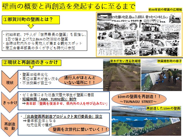 この現状をどうにかしようと構想を練っていたところ、平成30年に那賀川町にゼミ合宿に来た「徳島文理大学生」が壁画に着目したことで、壁画を舞台とした映画制作につながり、「壁画復活の思い」に火が着きました。