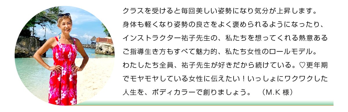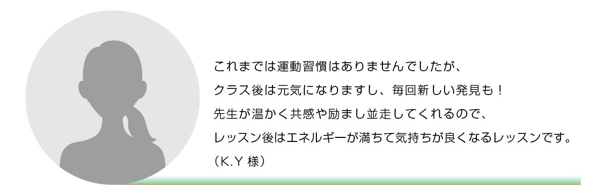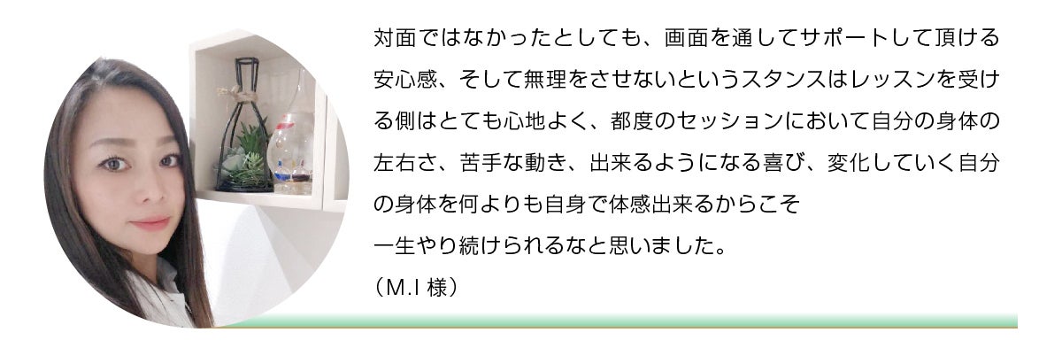 術後の傷ついた心への効果は大きかったようで、のちにこのような感想をいただき、今も、オンラインレッスンが彼女の体と心の支えとなっているようです。“あの時、オンラインレッスンがなかったら、今の自分はいません。日々の中の傷の痛みも、今では癌になったことで大切なことに気づかせてくれたし、前とは違う自分を生きています”