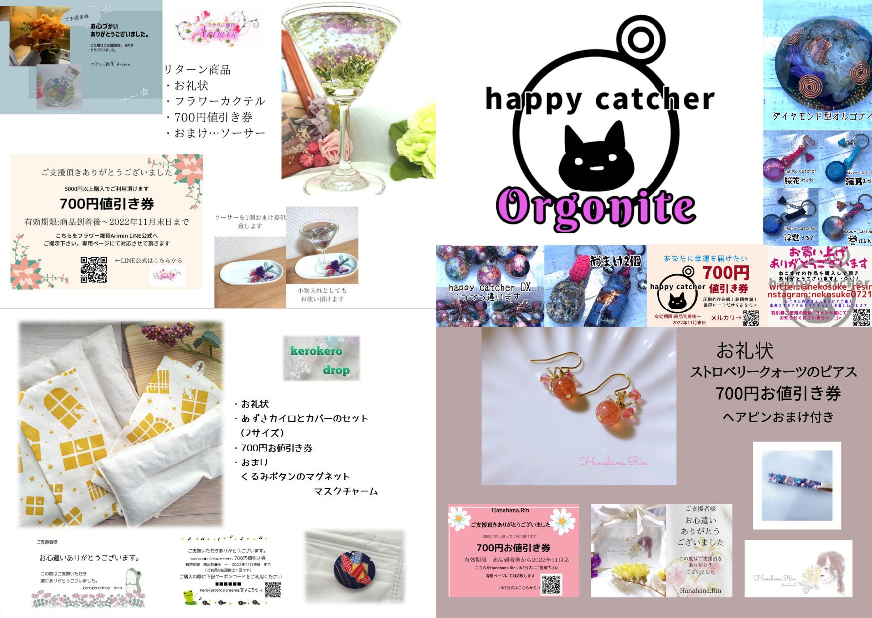 ・お礼状 ・ダイヤモンド型オルゴナイト1個 ・円錐型オルゴナイト1個 ・特大四角ねこ神様オルゴナイト1個 ・1000円値引き券 ・バースデークーポン