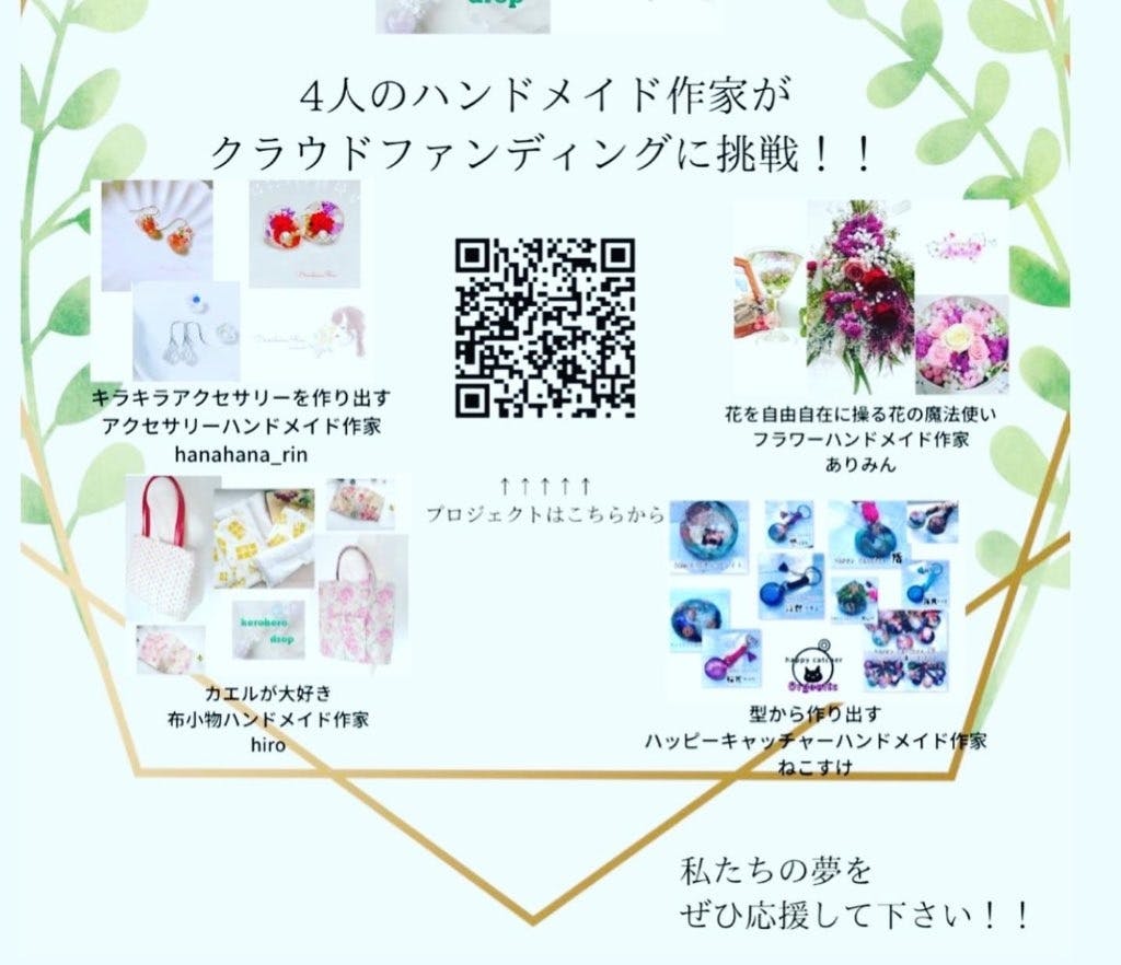 そして私達4人だけではなく、私達同様頑張っているハンドメイド作家さん達にも利用して欲しいと思っています。一度経験をしてプロジェクトを伸ばすことが出来れば、ハンドメイド作家としての自信にも繋がると思います。そして今回、クラウドファンディング挑戦を勧めたいと3人のハンドメイド作家さんに声を掛け、このプロジェクトを立ち上げました。