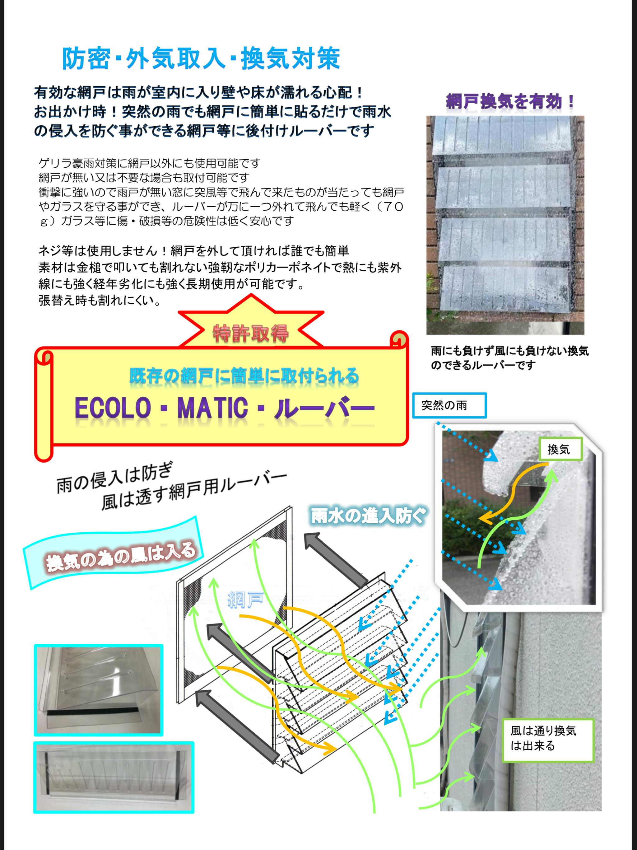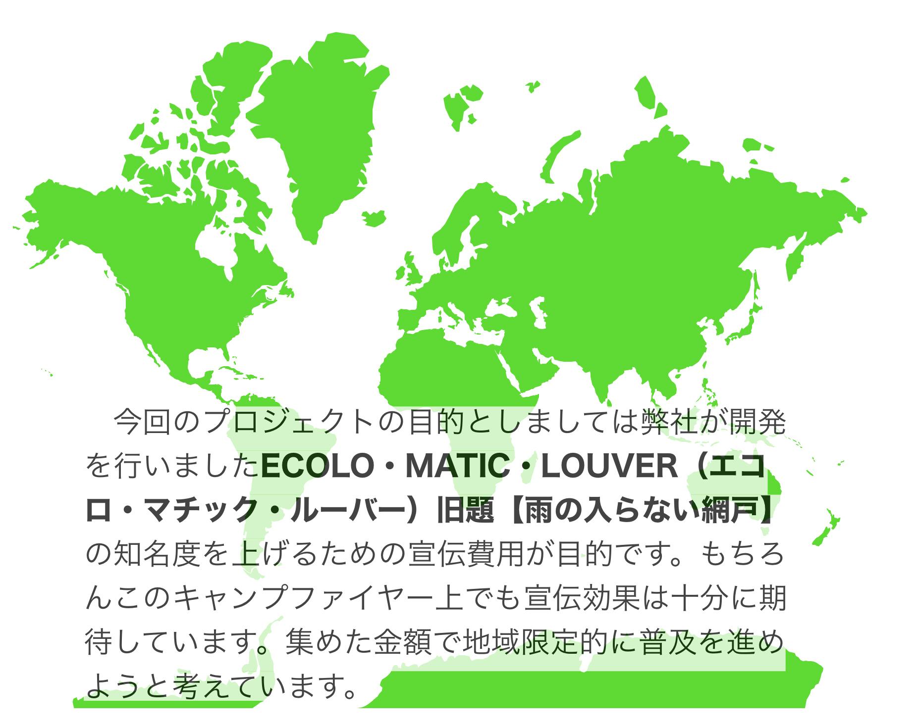 我々はこのECOLO・MATIC・ LOUVER【エコロ・マチック・ルーバー】の特許も取得しました。二の矢・三の矢の普及方法を考えています。人との出会いは様々な刺激を与えてくれます。この挑戦を支持いただけたらとても嬉しいです。