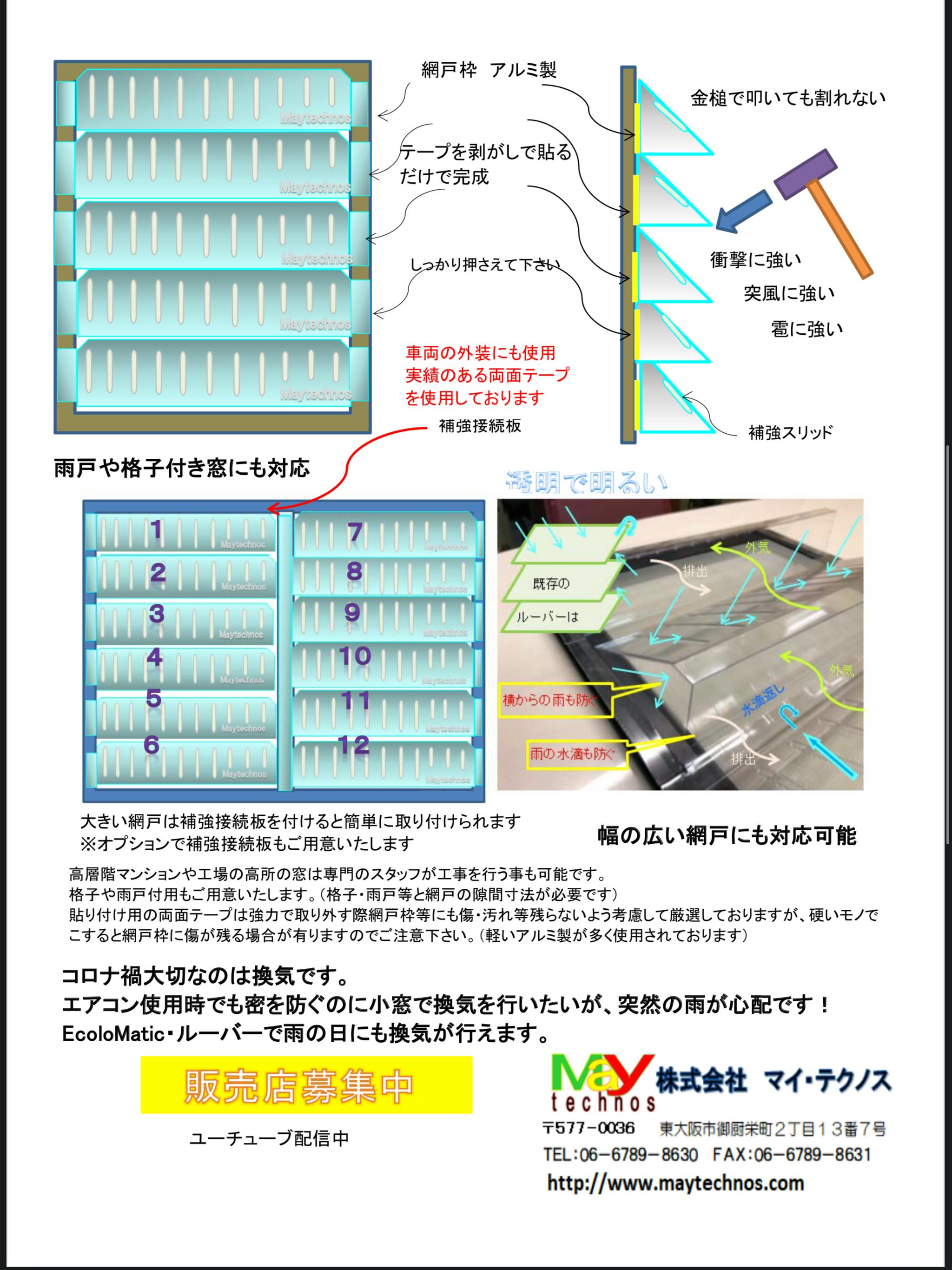 次期プロジェクトの一環として旧題【雨の入らない網戸】ECOLO・MATIC・LUVERの開発を2015年から行いました。2020年の11月にメッセ名古屋オンラインとテクノメッセ東大阪で製品発表を行ました。2021年7月に特許も取得しました。現在は「モノづくりの町」東大阪市が行なっている東大阪ブランド機構の認定に向けて取り組んでおります。