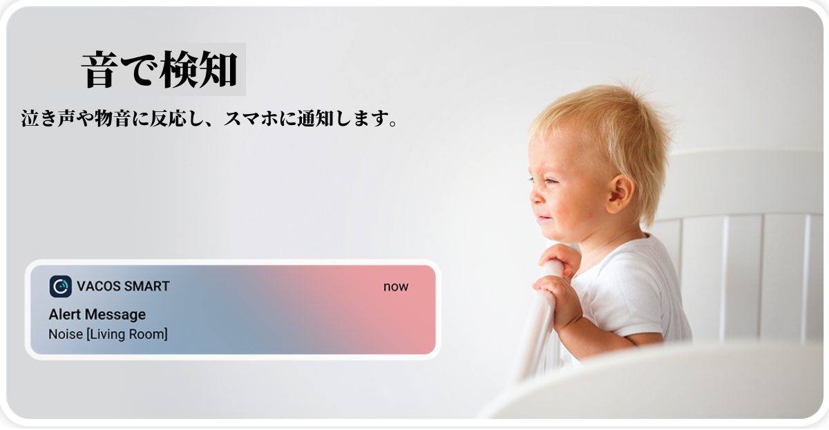 赤ちゃんの泣き声、物が落下した音、窓が開いた音などを感知できます。