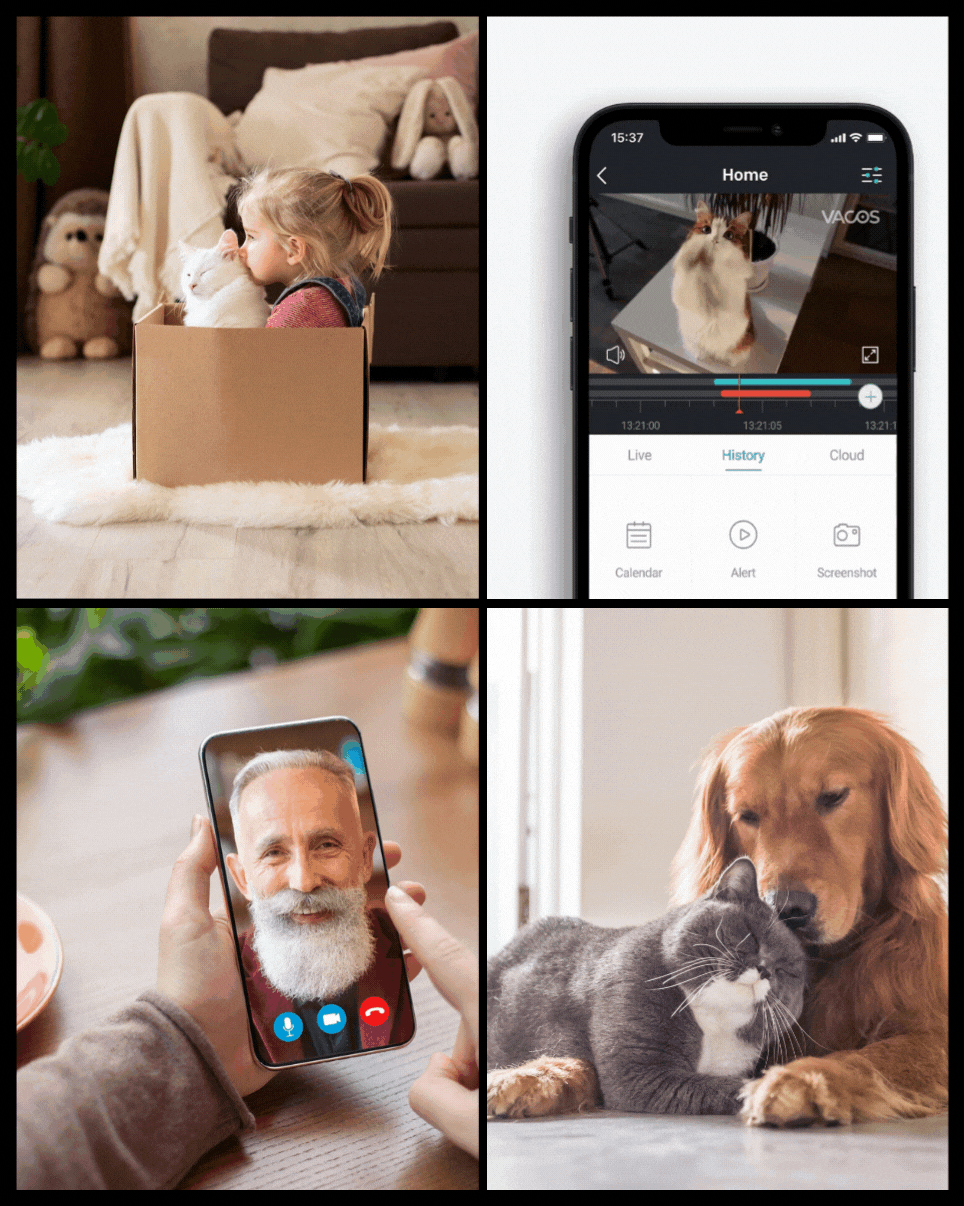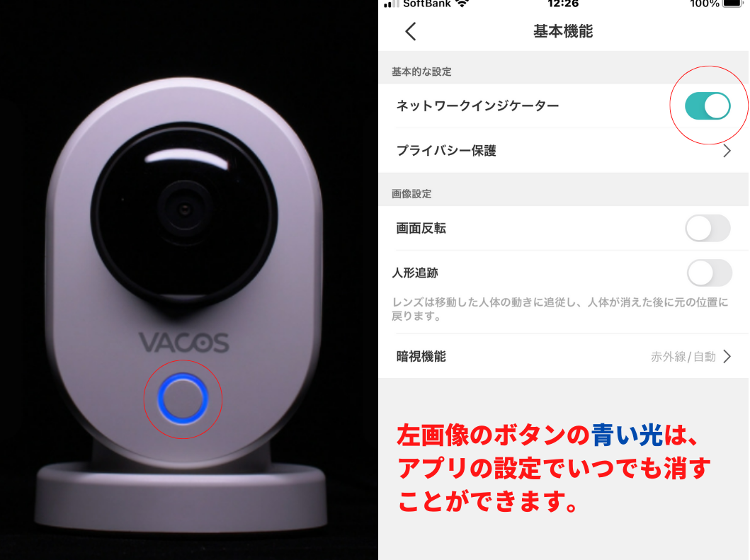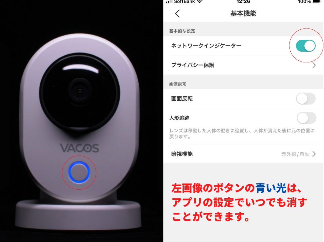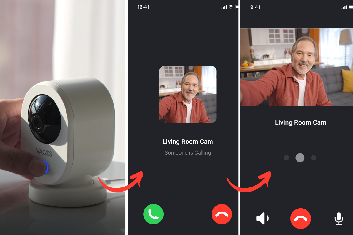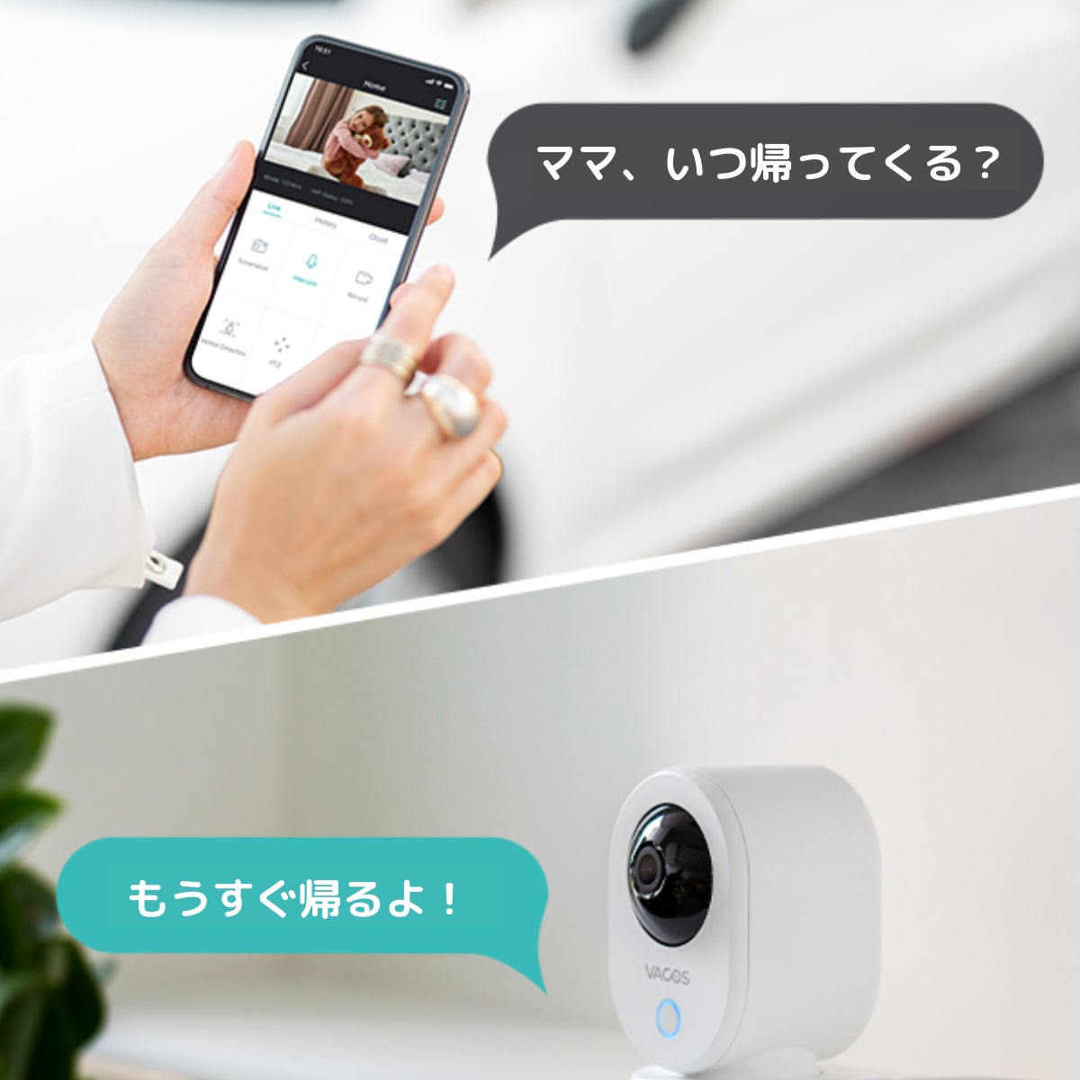 従来の防犯カメラは、スマホを持っている側(見守る側)からのアクセスが主でしたが、Vacos Cam PTはカメラ側(見守られる側)からも連絡できるのが特徴です!