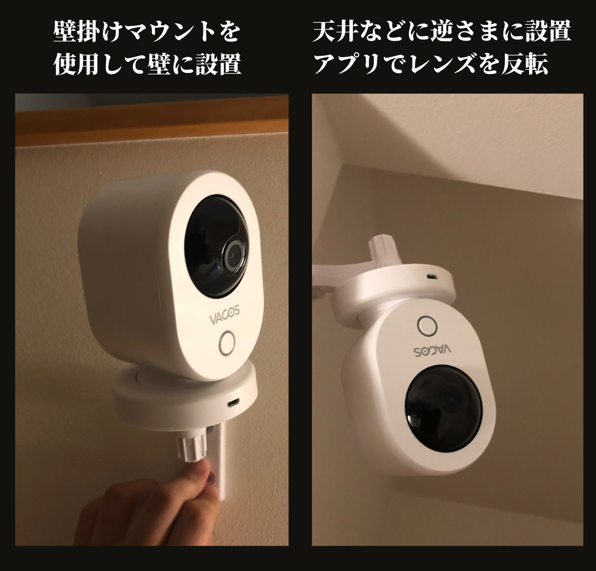 置くだけでなく付属の壁掛けマウントを使って、壁に取り付けたり、天井からカメラを逆さまに取り付けることも可能です。カメラが逆さまになっても、アプリの設定でレンズを反転にすることが可能ですので問題なく映像を確認することができます。