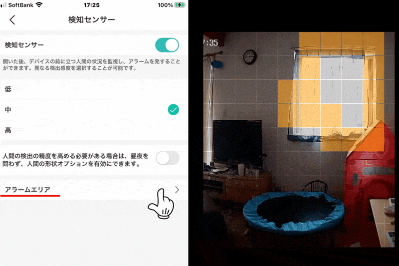 アプリの中に「アラームエリア」という項目があり、そこで検出エリアを自由に設定することができます。ぬり絵を塗るように設定し、消しゴムで消すように解除できます。
