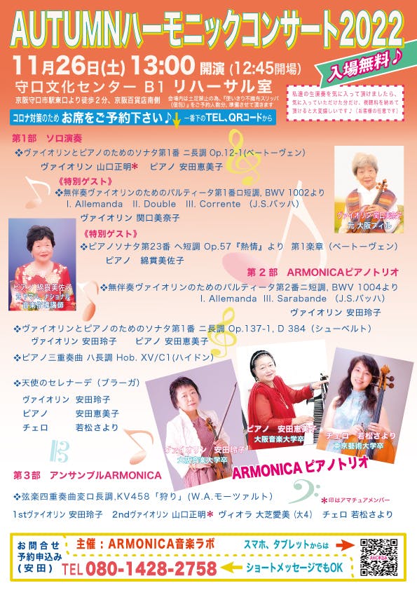 2022/11/09 13:30今年ラストになるコンサートのご案内です。『AUTUMNハーモニックコンサート2022』日時:11月26日(土) 13:00開演(12:45開場)場所:リハーサル室(守口文化センターB1) *京阪守口市駅下車、東口より徒歩2分。京阪百貨店南側。希望のピアニストのひとり、妹の安田恵美子@Pfですが、昨年9月1日に、コロナ重篤肺炎で緊急入院、幸い命が救われ、3週間で退院し、昨年末のコンサートにも、何とか出演できました。今年は、9月18日のARMONICAピアノトリオのコンサートにも出演。少しずつですが、回復してきています。今回は、今年ラストとなるコンサートに、希望のピアニストふたりが揃って出演します。今年85歳になる、もうひとりの希望のピアニスト、綿貫美佐子氏も、益々元気で活動されています。今回は、ベートーヴェンのピアノソナタ『熱情』より第1楽章を演奏されます。ヴァイオリンソロ、ヴァイオリンソナタ、ピアノトリオ、そしてラストには、Mozartのハイドンセットより『狩』(1楽章のみの予定)を演奏予定です。定員40名程度の小さいお部屋ですが、生演奏を身近に楽しんで頂きやすいと思っています。今回は、入場無料ですので、お気軽にお越し頂ければと思います。ただし、お席はあらかじめご予約をお願いしております。また、会場内は、土足禁止のため、当方で、個包されている使いきりスリッパをご用意します。(気になる方は、上履きをご準備いただければと思います。)表示のチラシの通りですが、事前の座席予約は、私宛てに 080-1428-2758 へお電話、またはSMSでご連絡を頂くか、表示のQRコードを読み込んでメールフォームへのご入力をお願いいたします。 もっと見る