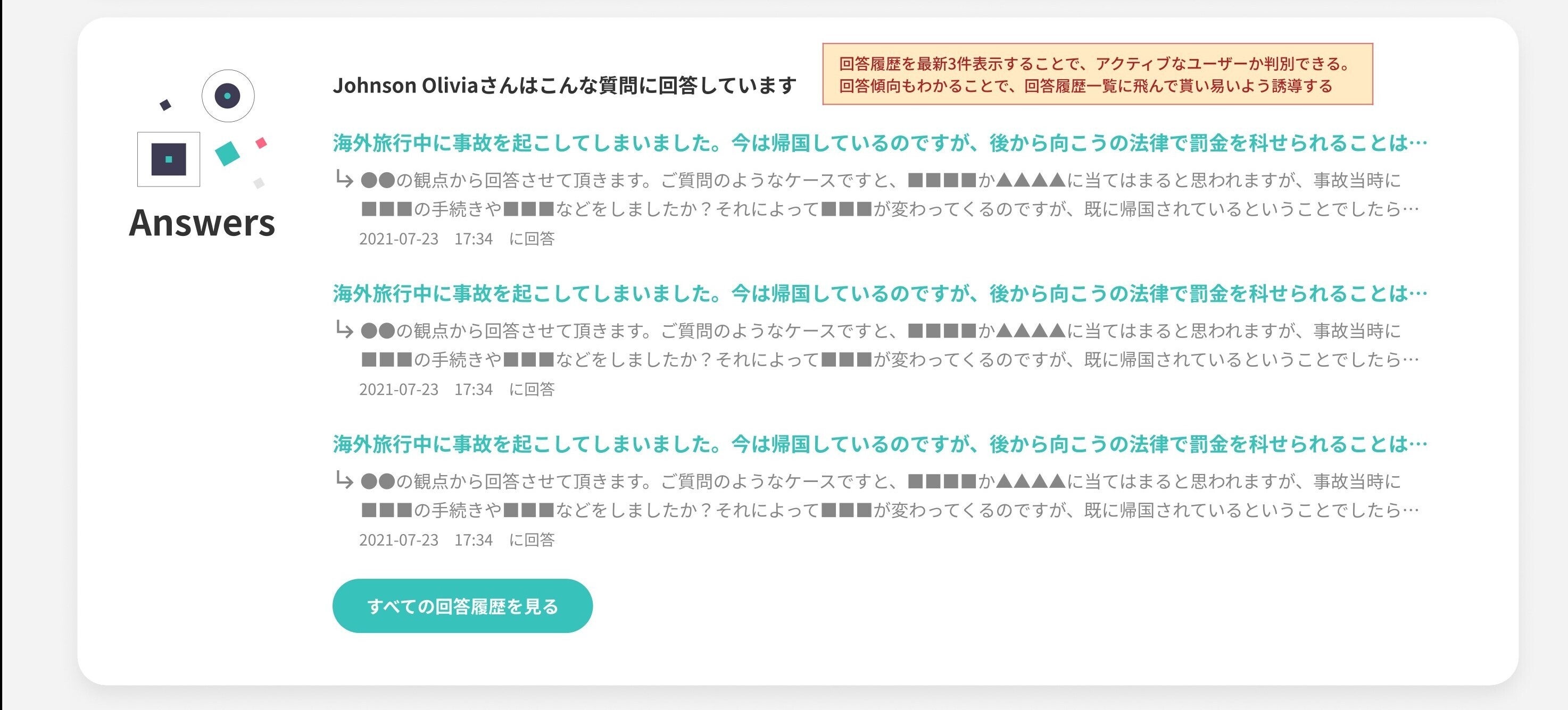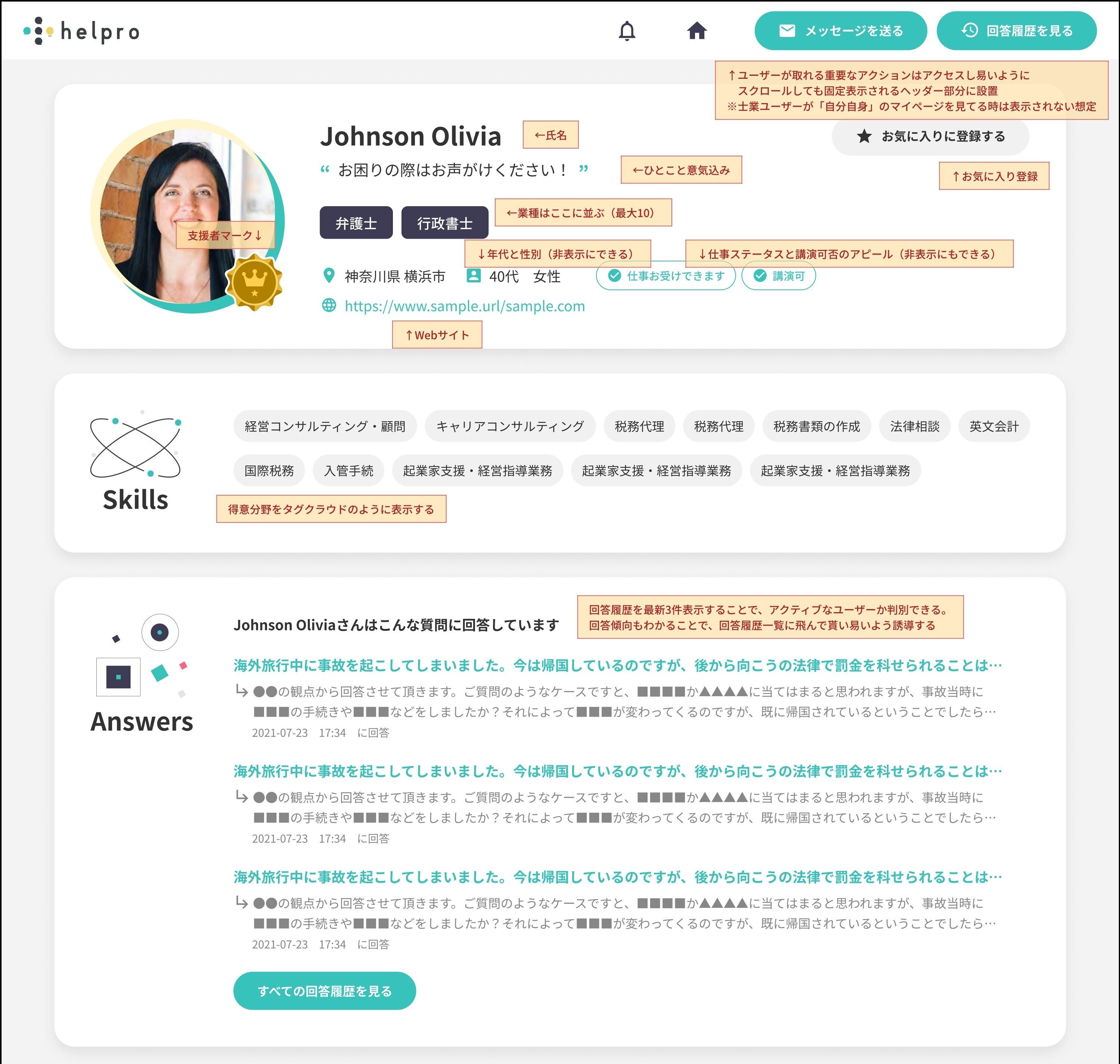 例えば② 士業さんがヘルプロ内で回答された履歴はプロフィールに紐付けらます。これまでにどのような問題にどのように回答されたかを確認できますので、人となりを想像することができるでしょう。
