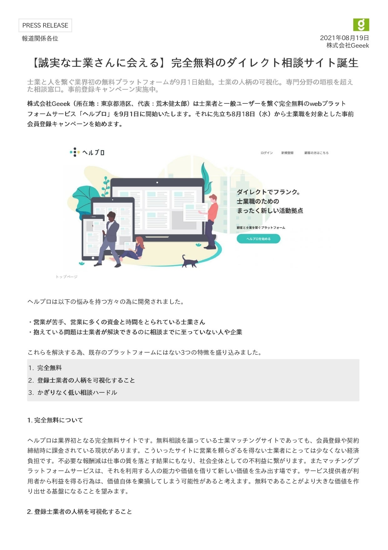 8月18日 サイトへの登録開始 (登録のURLはこちら→https://helpro.jp/register