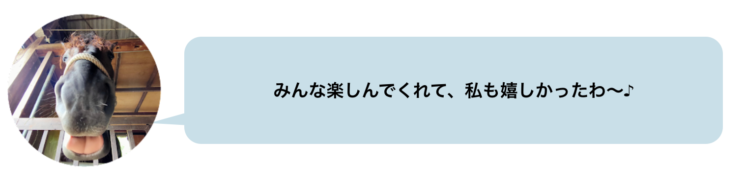 このような原体験を提供することで、将来的に馬に対して親近感を抱き、馬と人との関わりについて何かしらのアクションを起こす人物に育ってくれたらいいなと思い、未来への種まきとして取り組んでいます。
