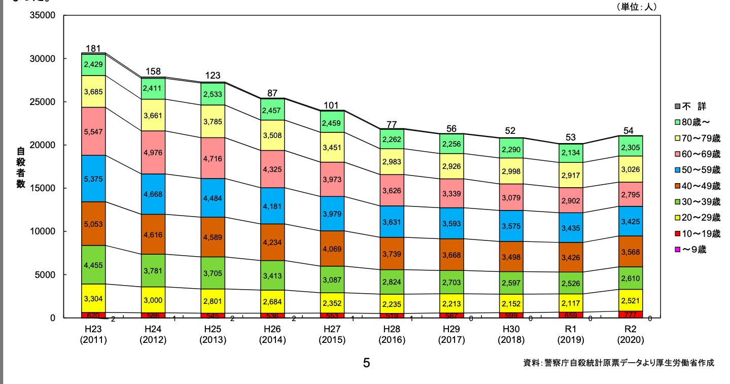 図3──「年齢階級別自殺者数の年次推移」(厚生労働省「令和2年中における自殺の状況」p.5)