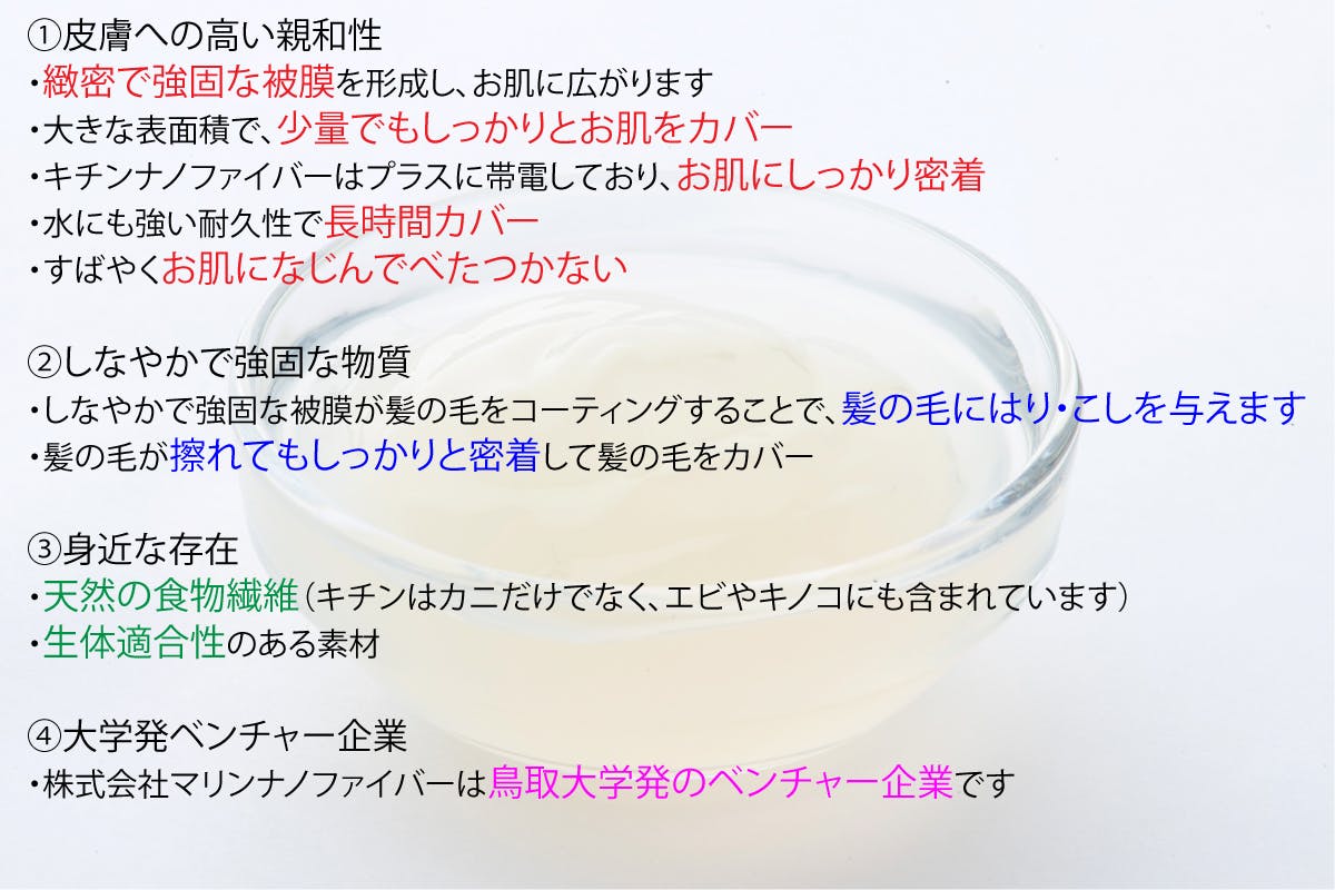 私たちは2016年4月に設立した鳥取大学発のベンチャー企業、株式会社マリンナノファイバーです。弊社は、全国でも数少ない『キチンナノファイバー』という素材を製造販売している会社です。そして、それを高配合した化粧品やペット用品も販売しております。