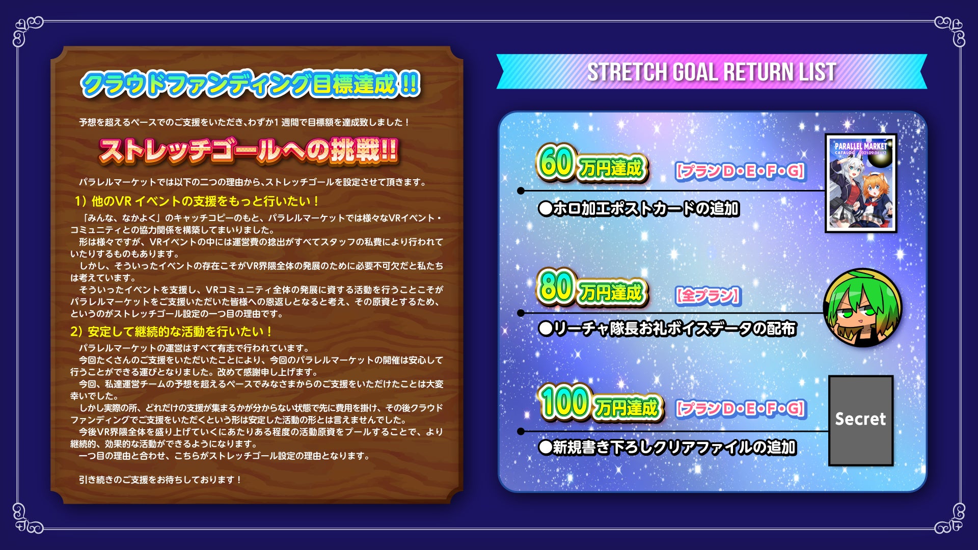 達成後のアクションとしてこのたびパラレルマーケット運営では、ストレッチゴールの設定をさせていただくこととなりました。