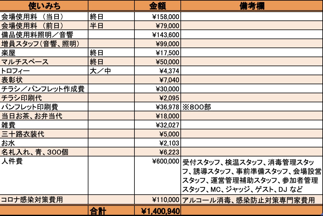 2021/09/04 01:36情報の不備や不足情報を追加します。ご迷惑をお掛けします。①チームエントリーチケット500円は各部門に出場するチーム分ご購入下さい。※参加する人数ではなくチーム数です。※先ずは、チームとしてエントリーする枠を確保して頂く必要があります。※エントリー枠を確保後、参加人数 × 3500円の参加費を別途お振り込み頂く流れになります。※コンテスト部門とパフォーマンス部門両方に参加される場合、各部門ごとの参加費がかかります。団体コンテスト部門3名以上、団体パフォーマンス部門5名以上で参加をお願い致します。②観覧チケットについて保護者を含む全ての観覧者について、原則として無料で観覧は可能になります。応援者を近くで観覧したい保護者の方や、前列でパフォーマーの写真撮影を障害物なして撮影したい方に関しまして、前列の座席確保チケットとして、・¥3,000 前列で大会を観覧できる券を発行します。・¥5,000 前列で大会を観覧できる券を発行します+大会当日、応援用の『うちわ』をお渡しします。というリターンを設けております。③コンテスト部門の訂正上記にも記載させていただきましたが、本文中での説明部分で訂正があります。¥500円:チームエントリーチケット(団体コンテスト部門)を発行します。※ × チーム員数は原則、5名以上〜になります。×※○ チーム員数は原則、3名以上〜になります。○④各部門の制限時間についてコンテスト部門1チーム 3分 以内パフォーマンス部門1チーム 5分 以内とさせて頂きます。⑤出場に関する追記事項BURN OUTでは、全世代が楽しめるようにコンテストの賞を設定しています。優勝、準優勝の他にベストドレッサー賞ベストスマイル賞ベストチームワーク賞ベストハッスル賞ベストファニー賞を設けさせていただいております。ダンスの技術はもちろん大切ですが、何よりもダンスを楽しむこと、一生懸命にダンスと向きうことをの素晴らしさを感じてもらいたいと思っております。 もっと見る