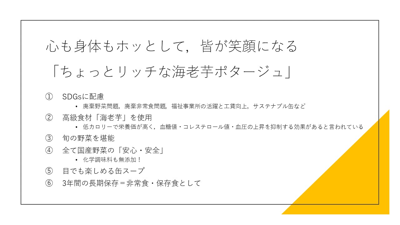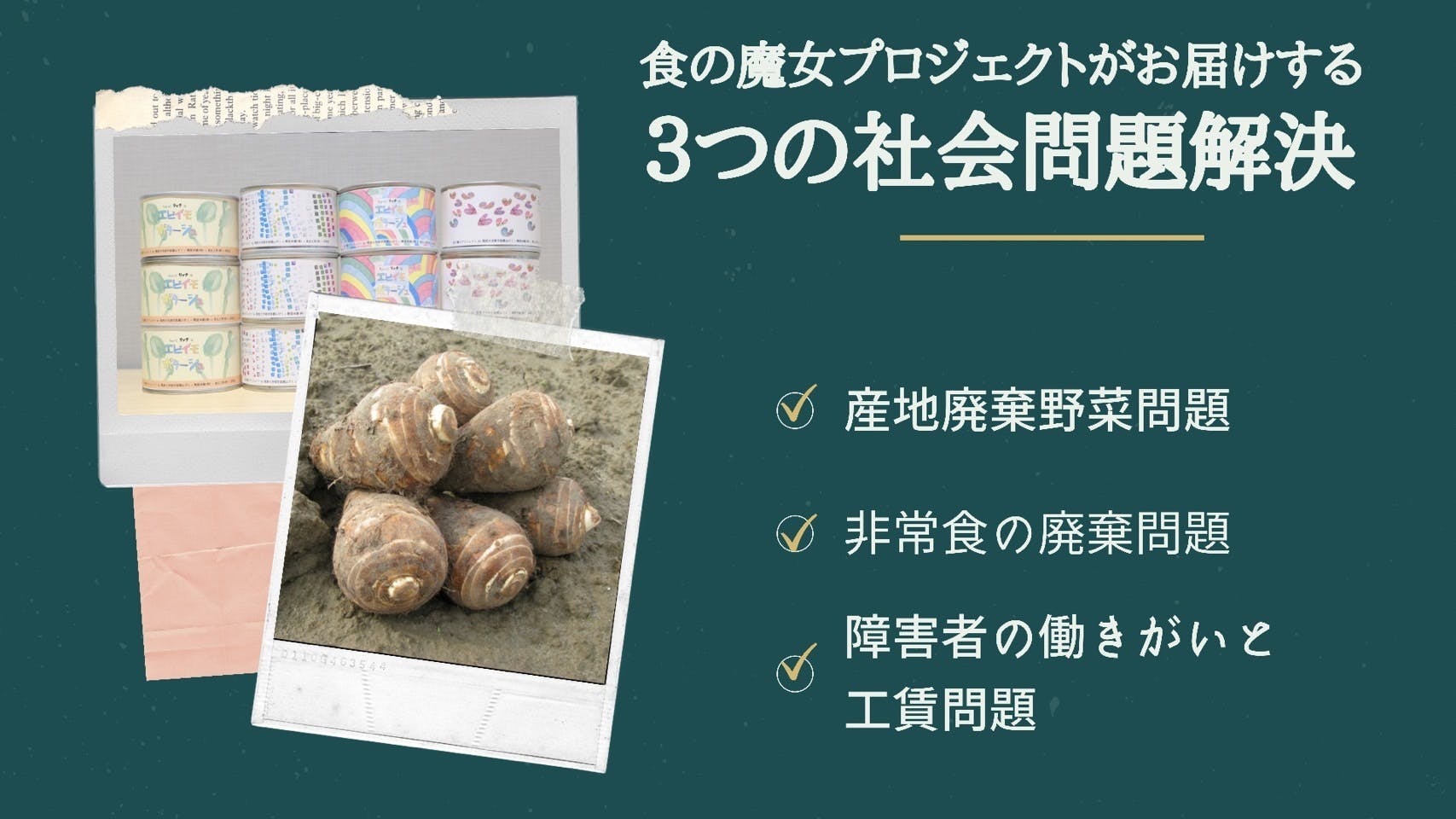私達の「食の魔女」プロジェクトでは,この「ちょっとリッチな海老芋ポタージュ」の販売を通して, ①産地廃棄野菜問題,②非常食の廃棄問題,③障がい者の働き甲斐と工賃問題といった3つの社会問題を解決し,皆が笑顔になる社会を実現したいと考えています。