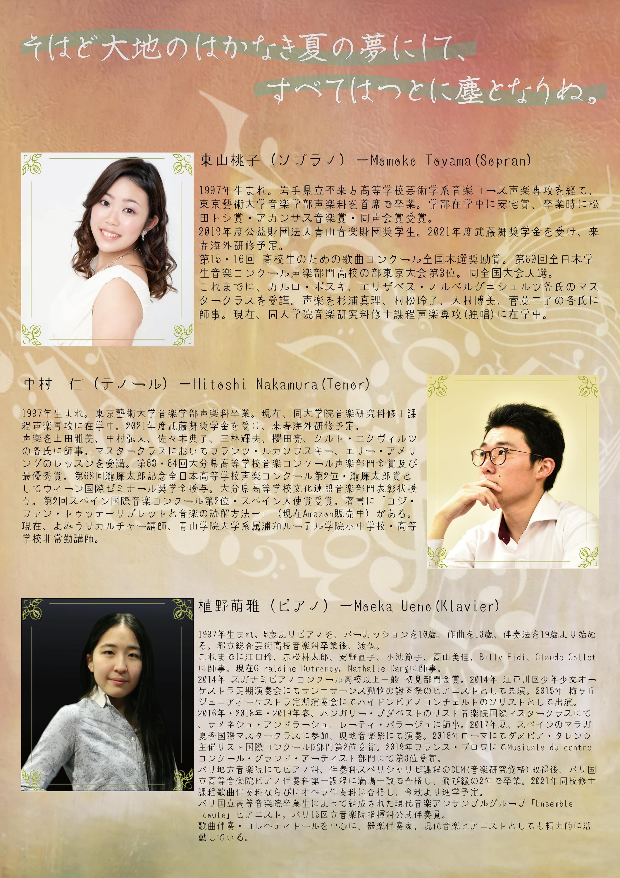 そこで今回、ウィズコロナ時代における新しい芸術活動の取り組みとして、シェーンベルク作曲の『グレの歌』を3人のソリストのために編曲して上演及びDVD販売を行います。この曲はもともとオーケストラに加え5人の声楽ソリストが必要とされますが、今回は感染症対策も含め、出演者3人で演奏を行う運びとなりました。
