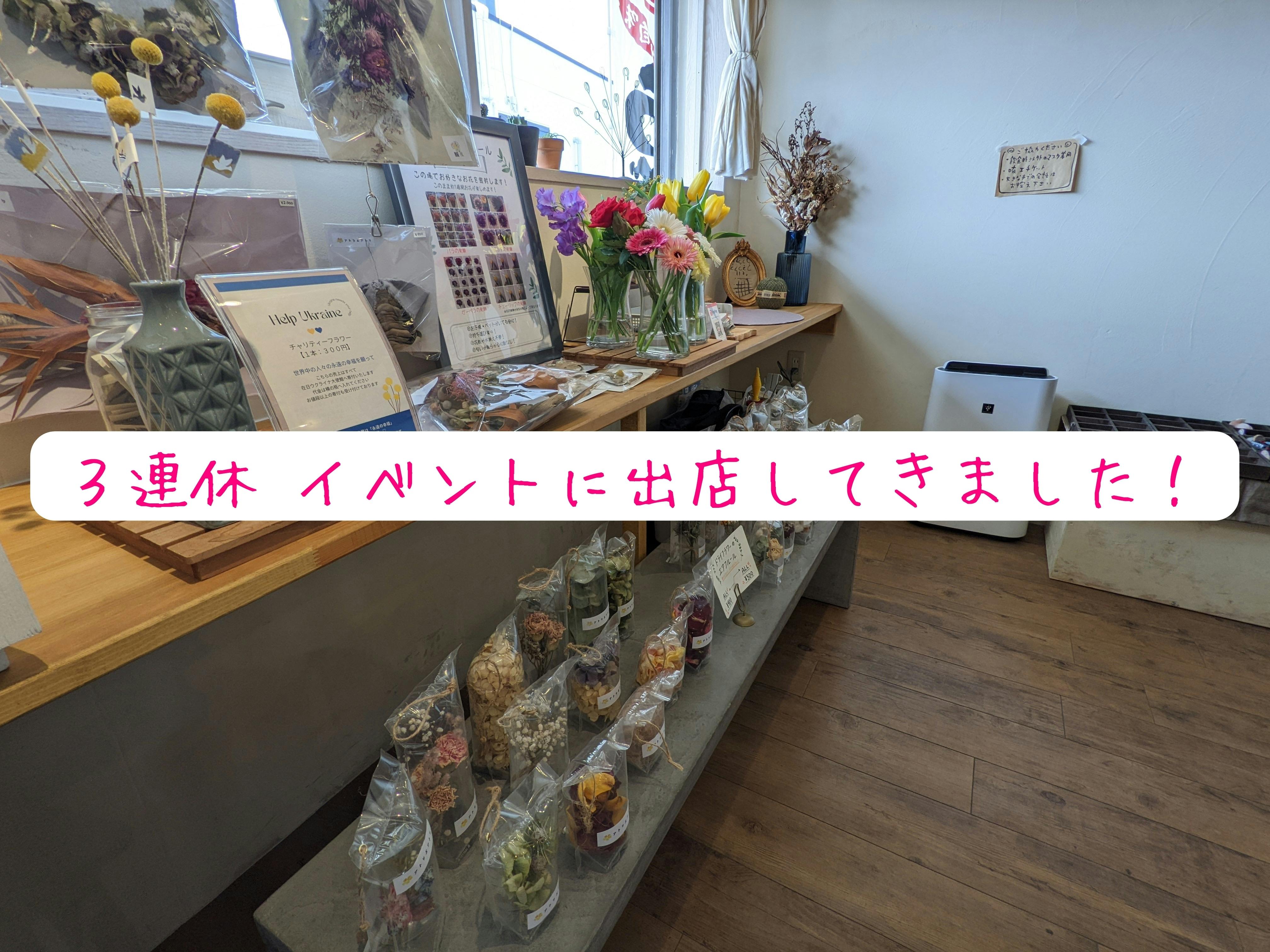 2022/03/22 11:163連休はイベントに出店してきました!▷土曜日[よってけし!古民家やまぼうし]今回は平和をテーマにした企画が盛りだくさん!花手水もウクライナカラーをイメージして青と黄色の2色で❀チャリティーフラワーや、お花で楽しい時間を過ごせましたというお声で改めて”お花の力”の凄さを実感できました!▷日曜日[放光寺・参道市]梅が咲いているのでカメラを持った方や、お彼岸でお墓参りにいらっしゃる方で賑やかな1日〜可愛い〜!とお花を見てくださる皆様にとても励まされました!また、新しいチラシも持参していたので、それを見て事業に興味を持ってくださった方もおり、とても嬉しかったです❀▷月曜祝日[Teeth's Marche]初出店のこちらは、初の屋内出店!そしておしゃれすぎる店内なので、ディスプレイにも力が入りました!いつもは風で飛んでしまうエアフルールも安心して並べられ、ずらっと並んだ光景は圧巻!!新しい見せ方を発見できました!生花も気温や風、日光を気にせず穏やかに咲いておりました❀バタバタと過ぎていった3日間でしたが、多くの方とお話する時間をいただけました!お越しいただいた方々、運営・出店の皆様本当にありがとうございました!来週末はシャンモリレストランでの夜桜夕市へ参加します! もっと見る
