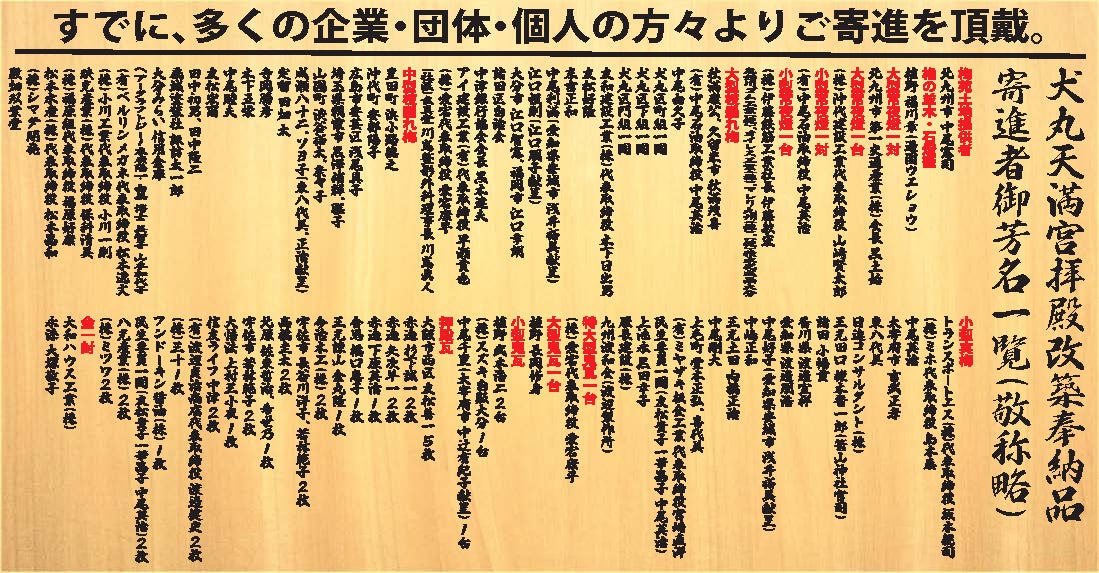 いよいよ10年計画も残り半年足らずとなり、当神社の隣接地に梅苑も完成し、梅の木の奉納も可能になりました。昨年2月には、太宰府天満宮様より紅白梅一対と香梅が恵与され、盛大に植樹祭が開催されました。個人の奉納者様から協賛企業様まで、幅広いリターンアイテムをご用意しました。境内には、歴代中津藩主が毎年参詣し、連歌の催しを開いた江戸期、「西の博多、東の中津」と言われた賑わいの商都でもあった頃の豪商たちが寄進した石燈籠も残っています。犬丸天満宮奉賛会によるPR活動によりマスコミにも度々取り上げられ、参拝客も増えてきています。企業様の広告宣伝ツールやCSRとしてもご活用ください。拝殿改築の暁には祈りの旅、梅見の名所として観光引力強化に励む所存です。