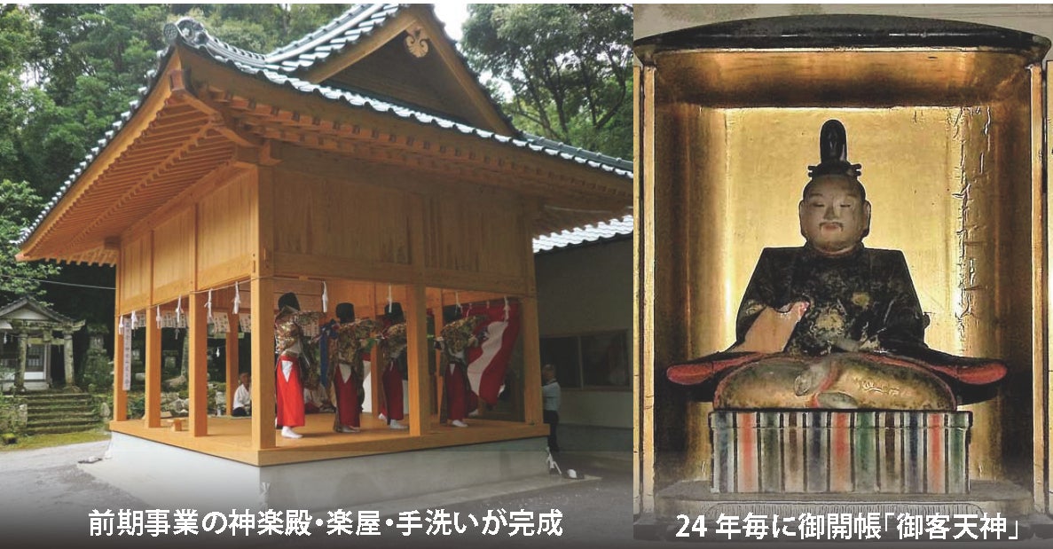 さて、当神社は創祀1060余年の歴史を誇る古社ですが、百年以上も前の明治後期に改築されて以来、幾度かの修繕を繰り返してきたものの社殿の痛みは激しく、特に明治~令和の風雪に耐え、崩壊寸前の「拝殿」と「神楽殿」を改築する運びとなりました。2012年から2021年の10年計画で氏子・崇敬者様から一戸当たり10万円の浄財をいただき、総事業費3000万円の規模でスタートしました。1500万円の目途がついた2016年に、前期事業の神楽殿・楽屋・手洗いが落成。さらに翌年に駐車場が造成されました。これらの新資産を活かし、2017年3月には24年に一度の、藩主小笠原長勝候が寄進した木造「御客天神」像をお披露目する「御開帳大祭」が、3日間盛大に開催されました。