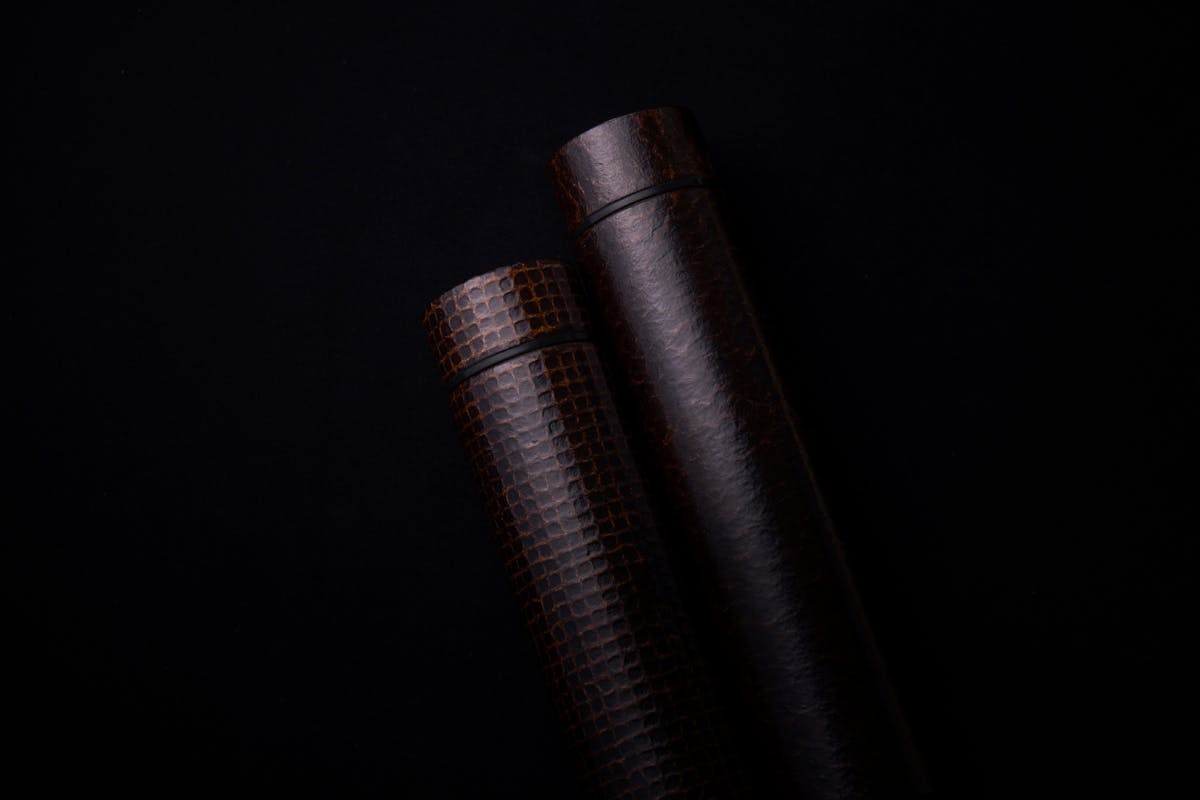 また、弊社が長年作り得意としてきたお茶道具に使われる技法「一閑張(いっかんばり)」を施した「URUSHI POKETLE 一閑」も新登場。和紙を貼り、その上から漆を塗り込む伝統技法で作る、革のようにも見える高級感のある質感をお楽しみいただけます。左:120ml  右:180ml(新モデル)