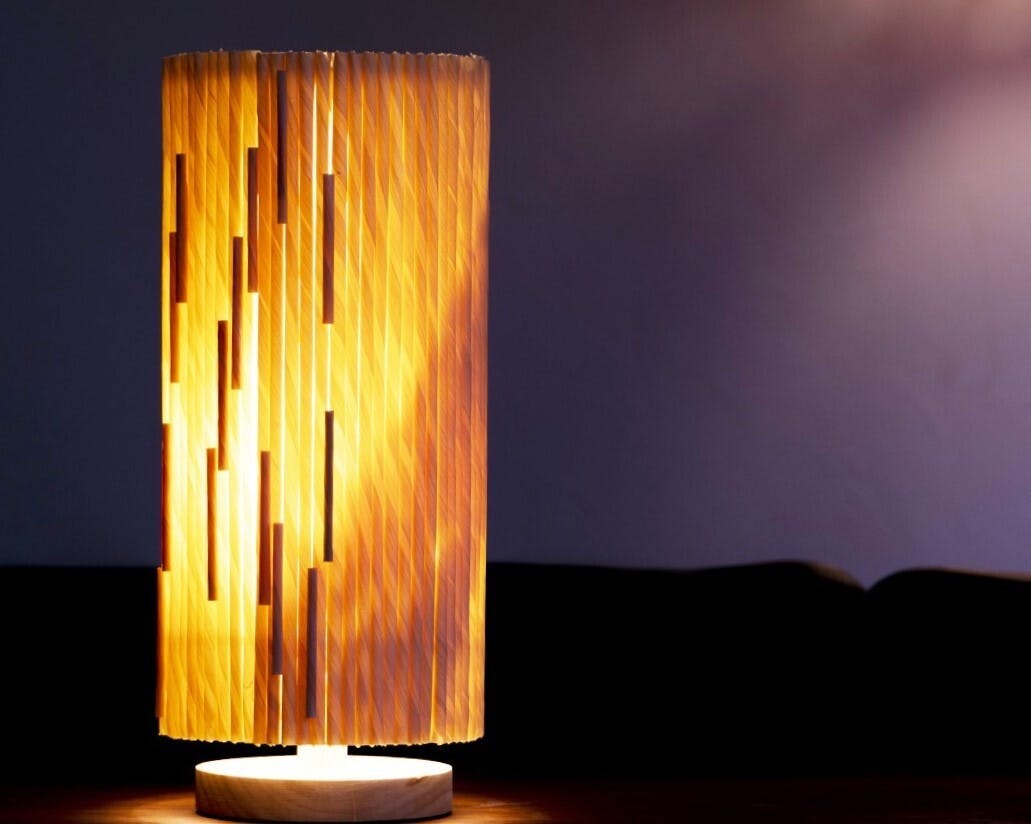 筒状に巻かれたフォルムから木目の風合いを感じる独特の光が空間を暖かく包み込みます。