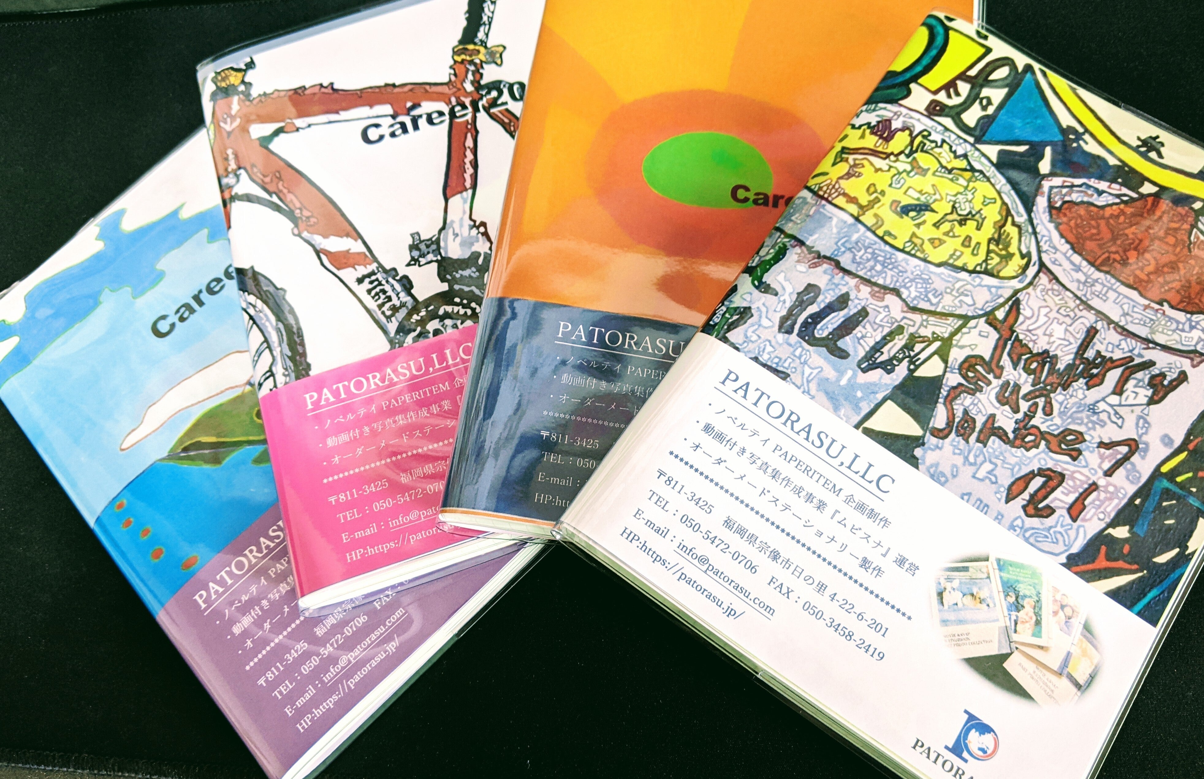 表紙は障害者支援施設提供のデザイン類からお選びいただき、腰帯にはオリジナルの企業広告を印刷し添付させていただきます(会社名、連絡先、キャッチコピー、HPアドレスやQRコード掲載でサイトへの誘引も可能です)
