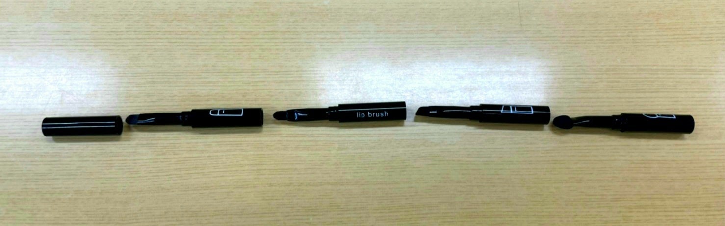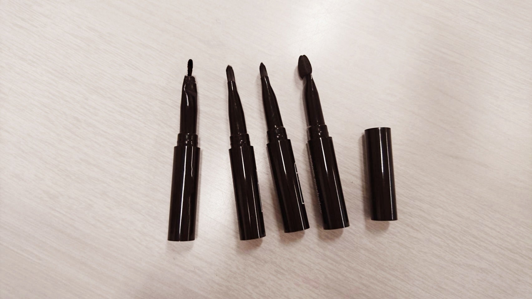 (この画像は、左から順に、アイライナー、アイシャドウブラシ、アイブロウ、チップです。)