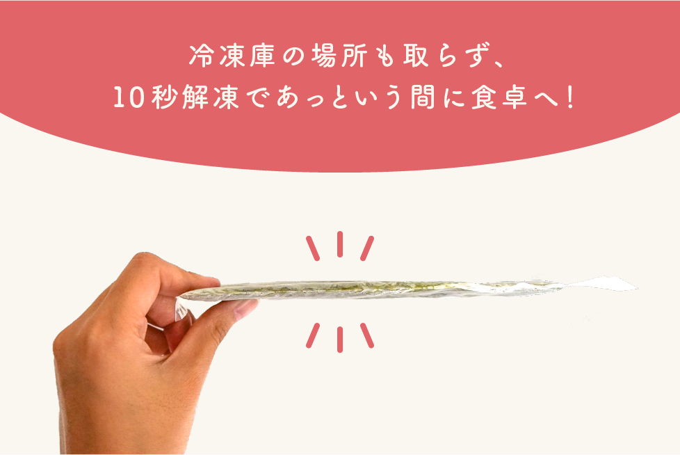 スルリと冷凍庫の隙間に入って場所を取らず、解凍時間は流水で約10秒。いつも冷凍庫に常備してあっという間に食卓に並べることができます。