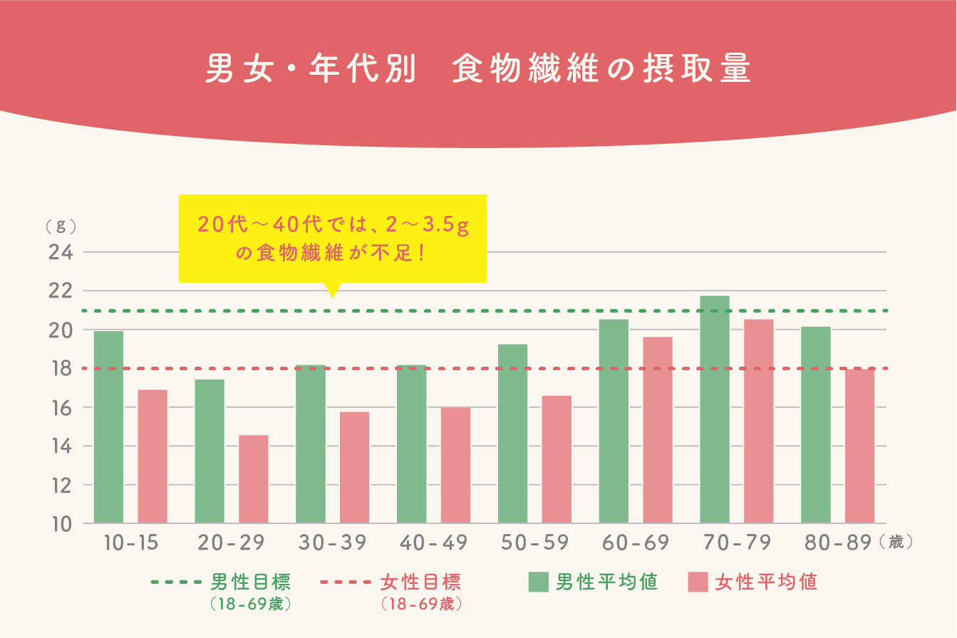 しかし多くの年代で食物繊維の摂取量が足りていません。